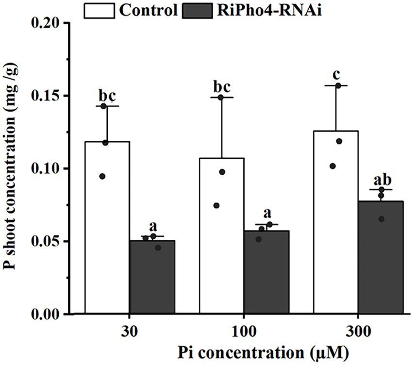 To determine whether RiPho4 regulates the symbiotic Pi transport in AM symbiosis of N. benthamiana, we examined the total P concentration of AM tobacco shoots of control and RiPho4-RNAi plants grown under three different Pi (30, 100, or 300 μM) conditions. As a result, the P concentration in AM plants of RiPho4-silenced lines were significantly reduced compared with control plants (Figure 7). This result indicated that RiPho4 may regulate Pi transport at the symbiotic interface of arbuscular mycorrhizas.