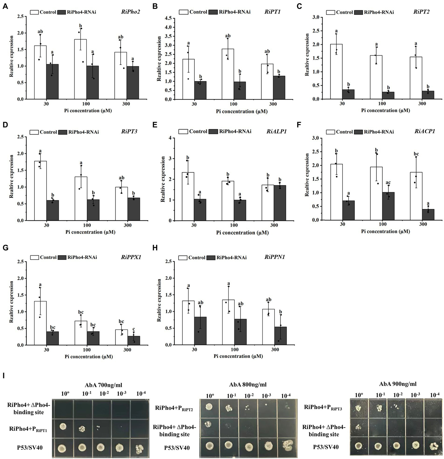RiPho4 regulates the expression of downstream genes involved in Pi transport and metabolism processes in R. irregularis. (A–H) Expression analysis of R. irregularis genes engaged in PHO pathway between RiPho4-RNAi and control roots under different phosphate concentrations. Expression levels of RiPho2(A), Pi transport genes RiPT1, RiPT2, RiPT3(B–D), phosphatase related genes RiALP1, RiACP1 (E-F), RiPPX1 and RiPPN1 related to Poly-P metabolism (G,H) in response to different phosphate concentrations were estimated by real-time qRT-PCR analysis. Different letters indicated significant differences between control and RNAi lines. The differences between samples were analyzed using Duncan’s new multi-range test at the alpha = 0.05 level. (I) Yeast one-hybrid analysis of the interaction between RiPho4 with promoters of RiPT1, RiPT2, and RiPT3. The promoter regions of RiPT1, RiPT2 and RiPT3 containing the cis-acting elements CACGTG/T named PRiPT1, PRiPT2, and PRiPT3. The identification of interaction between RiPho4 and the promoter of RiPT1, RiPT2, or RiPT3 under the screened even higher AbA inhibition concentration indicated in Fig. S4. Yeast cells carrying both pGBKT7-P53 and pGADT7-SV40 grown on SD/−Leu were used as the positive control, PRiPT1, PRiPT2, PRiPT3-ΔPho4-binding sites with pGADT7-RiPho4 were used as the negative controls. ΔPho4-binding site indicates the deletion of the Pho4 binding site (CACGTG/T) elements located in PRiPT1, PRiPT2, PRiPT3 promoters. 10-fold serial dilutions of yeast cells were spotted on plates, and the initial yeast concentration was OD600 = 0.2.