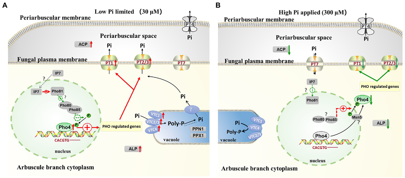 Earlier radiotracer studies have demonstrated that Pi travels from soils through the AM fungal hyphae to the host plants (Pearson and Jakobsen, 1993; Smith et al., 2003). In past two decades, the high-affinity transporter genes belonging to the PHT1 (PHOSPHATE TRANSPORTER 1) family that are expressed in the ERM and IRM have been identified and characterized from some AMF species, for example, GmosPT, GigmPT, GvPT, and RiPT from Glomus mosseae, Gigaspora margarita, Glomus versiforme (currently Diversispora epigaea), and Rhizophagus irregularis (Harrison and van Buuren, 1995; Maldonado-Mendoza et al., 2001; Benedetto et al., 2005; Fiorilli et al., 2013; Xie et al., 2016; Sun et al., 2019; Venice et al., 2020). AMF can absorb Pi from soil by ERM, and polymerize Pi into polyphosphate (Poly-P) by vacuolar transporter chaperone (VTC) complex; the Poly-P was accumulated in the vacuoles, and then transferred to the IRM associating with water transport process (Kikuchi et al., 2016). The Poly-P phosphatases Ppn1 and Ppx1 in IRM can hydrolyze the Poly-P into Pi, and export it from vacuoles to the cytoplasm through the unknown P transporters located in the vacuole membrane (Solaiman et al., 1999; Ezawa and Saito, 2018; Xie et al., 2022).