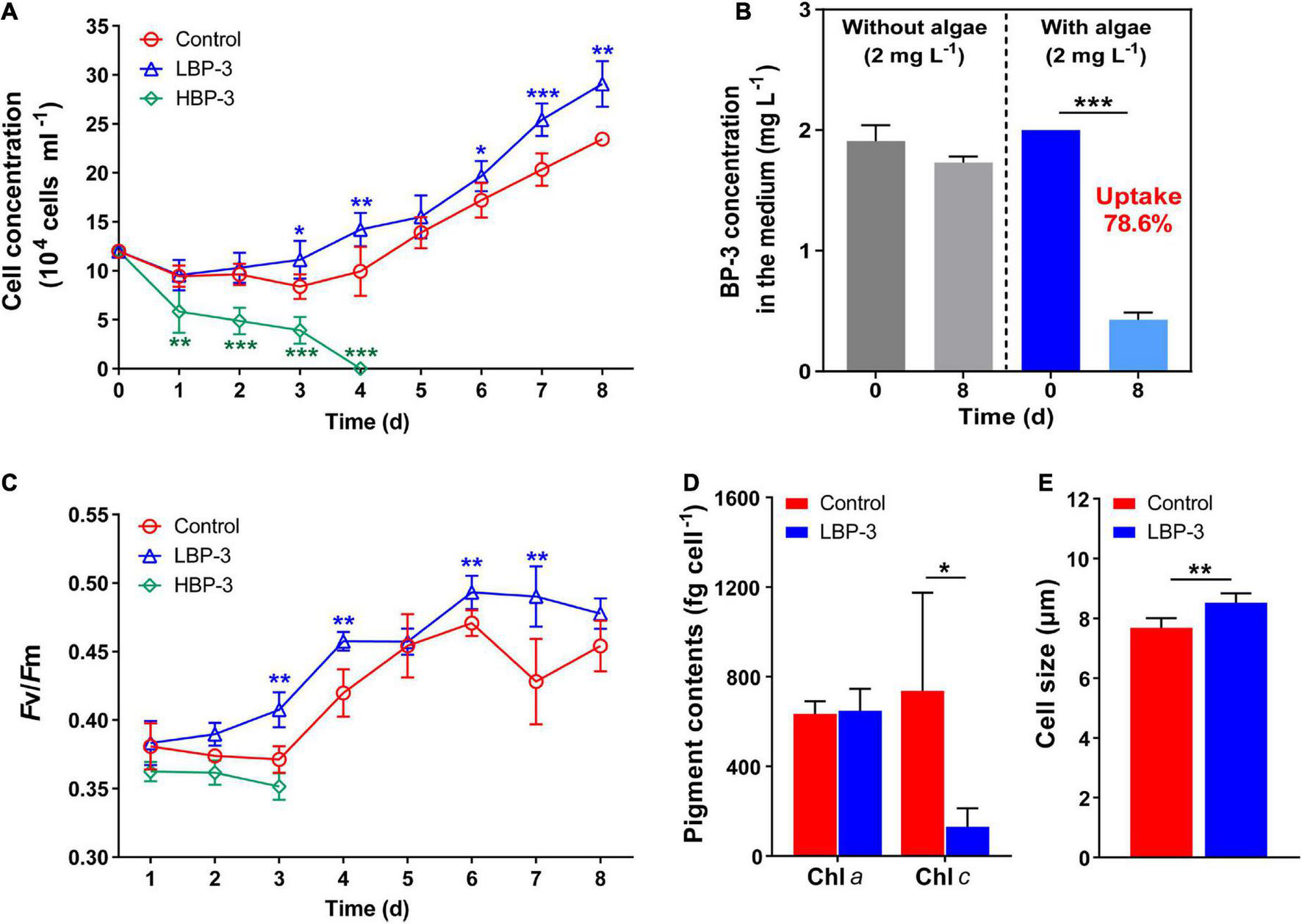 Physiological responses of C. goreaui to benzophenone-3 (BP-3). (A) Cell concentration. (B) Photodegradation of BP-3 under abiotic conditions (left) and BP-3 uptake by C. goreaui under the LBP-3 condition (right) over 8 days. (C) Photosystem II (PS II) maximum photochemical yield (Fv/Fm). (D) Pigment contents. (E) Cell size. Each data point is the mean from six replicates with the error bar indicating standard deviation (mean ± SD, n = 6). Asterisks (*p < 0.05; **p < 0.01; ***p < 0.001) indicate significant differences between different groups.