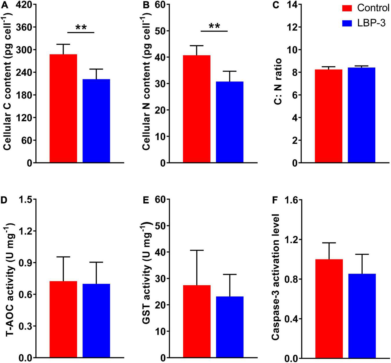 Cellular responses of C. goreaui in response to 2 mg L– 1 benzophenone-3 (BP-3) addition. (A) Cellular C content; (B) cellular N content; (C) C:N ratio; (D) total antioxidant capacity (T-AOC) activity; (E) glutathione S-transferase (GST) activity; (F) caspase-3 activation level. Data were collected from control and LBP-3 cultures (n = 6) after 8 days incubation. Each data point is the mean from six replicates with the error bar indicating standard deviation (mean ± SD, n = 6). **p < 0.01 indicate significant differences between different groups.