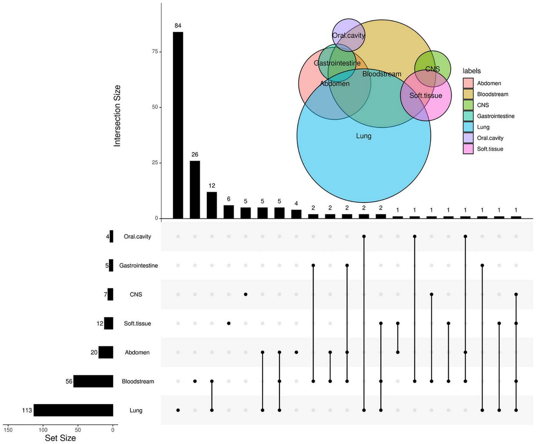 Venn Upset plot of the distribution of sites of infection. The Venn diagram in the right upper area represents the intersection for different sites of infection. In the upset diagram, each row represents the site of infection; the number at the end of each bar represents the total cases with this site infection, and each column represents the case number of every situation, especially patients with multiple sites of infection. The number at the end of each bar represents the cases with infection at the sites the “black dots” located. The black dots connected by line indicate multiple infections.