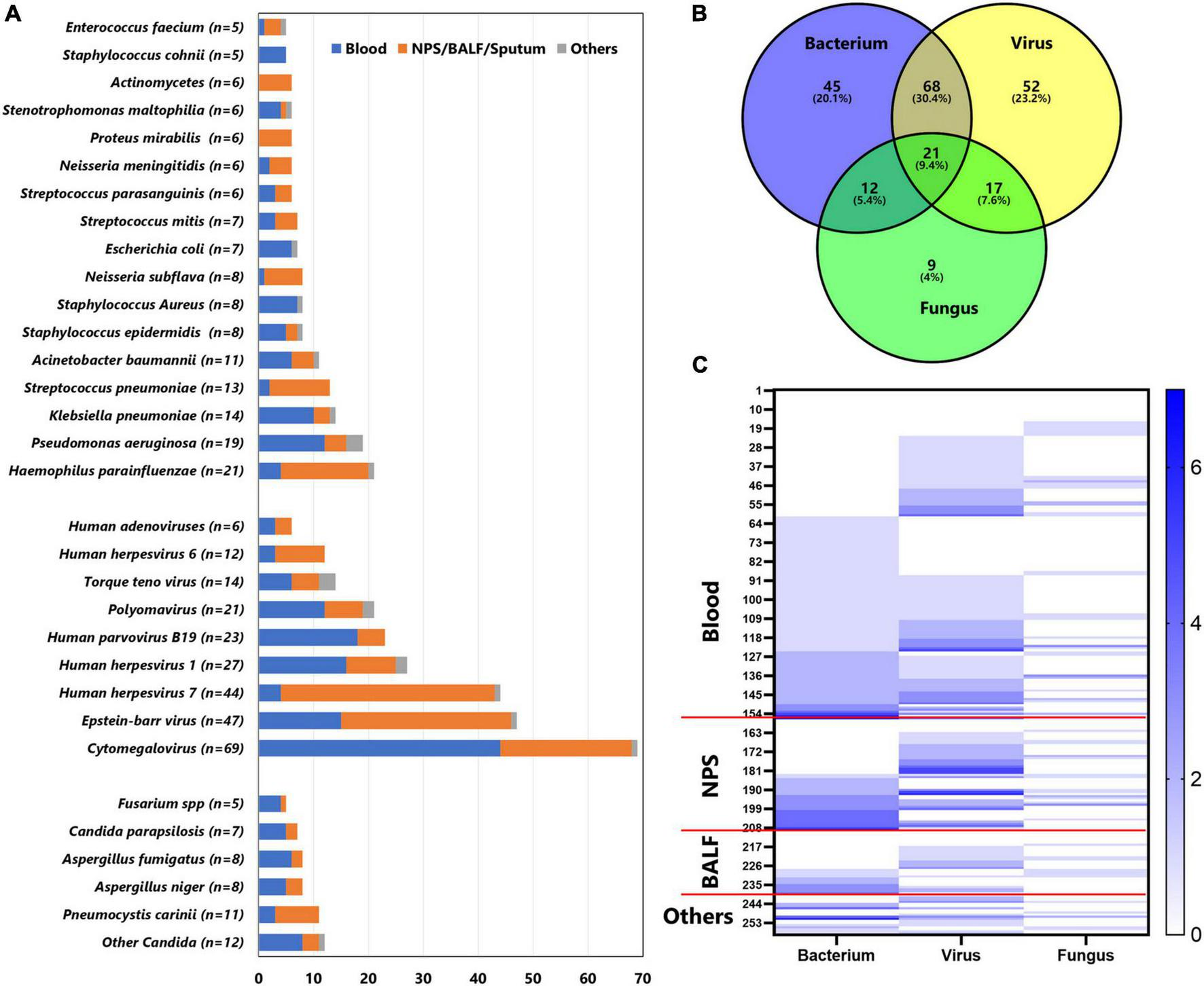Distribution of main pathogens identified in this cohort by mNGS. (A) The figure showed the number of organisms detected in different specimens. Blue bars indicate organisms detected in blood, orange bars indicate organisms detected in nasopharyngeal swab (NPS), bronchoalveolar lavage fluid (BALF), or sputum; gray bars indicate organisms detected in other specimens (pus, hydrothorax, ascites, and cerebrospinal fluid). (B) Venn diagram represents the intersection for different microbiological species. (C) Heatmap represents the number of bacterium, virus, and fungus detected in each specimen. The left y-axis indicates the case number. The counts of bacterium, virus, and fungus in the same specimen are shown in color, with larger counts associated with darker colorings.
