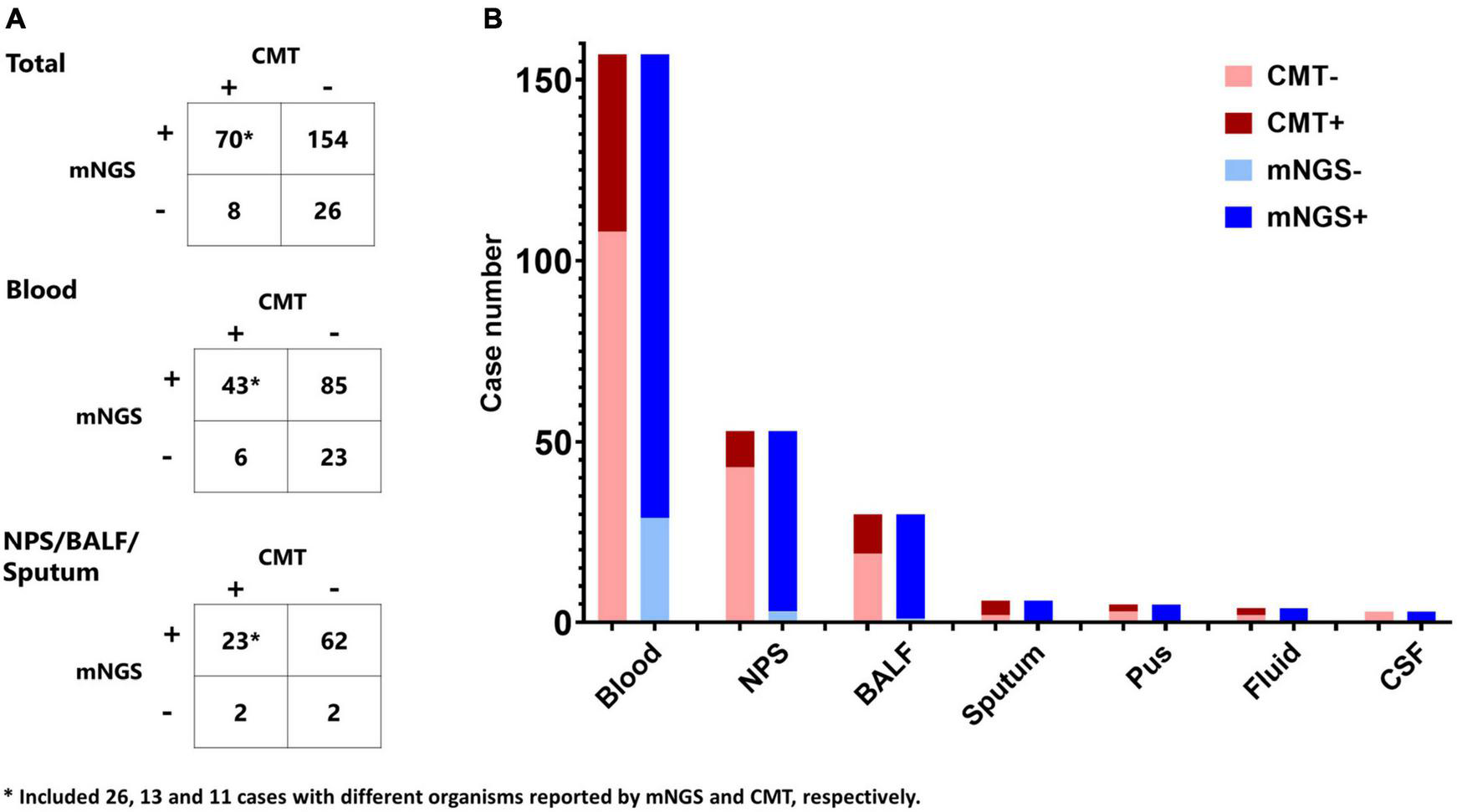Comparison of mNGS and conventional microbiological tests (CMT). (A) Contingency tables for the agreement of mNGS and CMT in total cohort, blood specimen, and nasopharyngeal swab (NPS)/bronchoalveolar lavage fluid (BALF)/sputum. (B) Comparison of the positive cases of mNGS and CMT in different specimens.