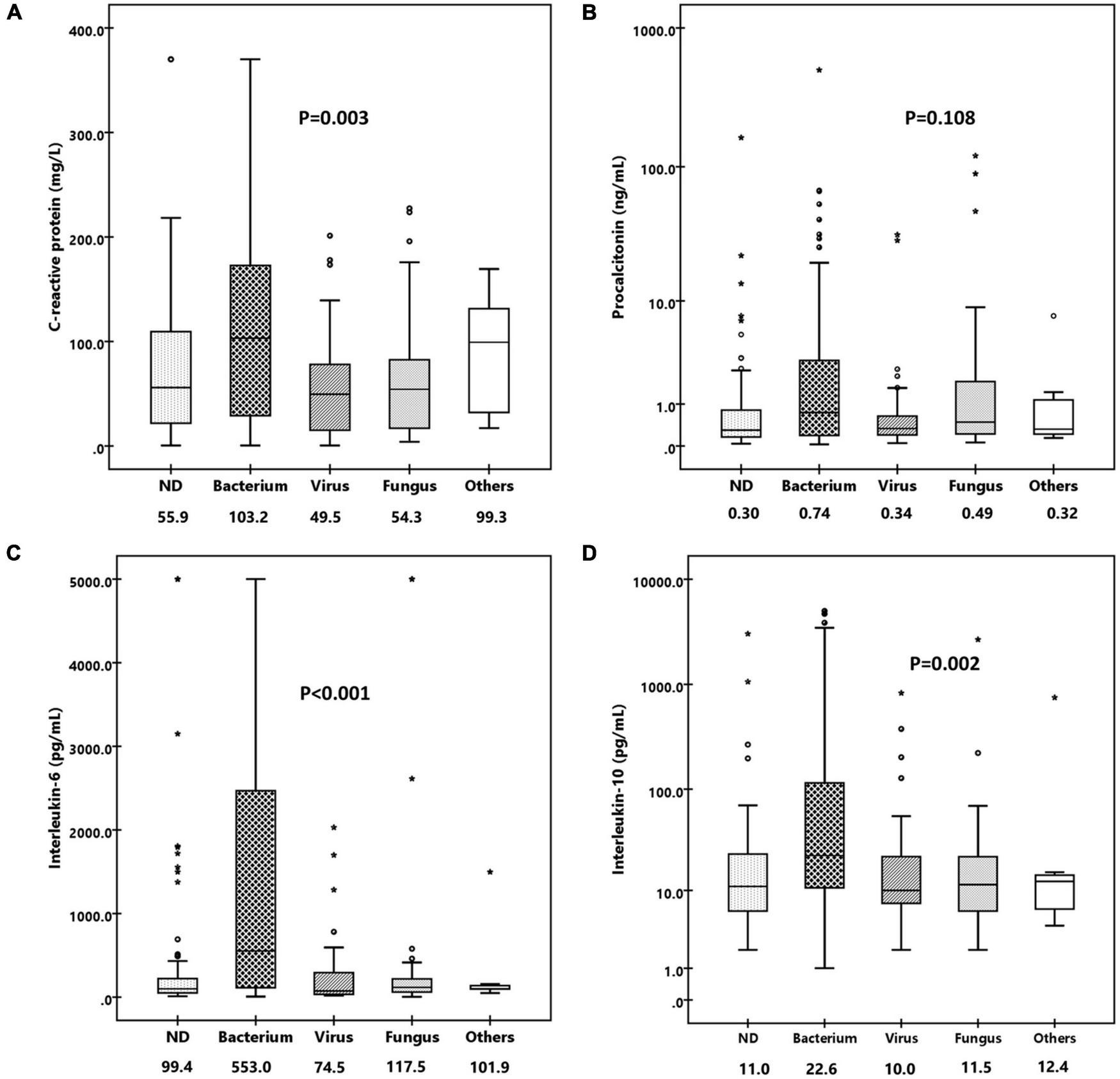 Comparison of levels of various inflammatory biomarkers in patients infected with bacterium, virus, fungus, and others. (A) Box-and-whisker plots of C-reactive protein. (B) Box-and-whisker plots of procalcitonin. (C) Box-and-whisker plots of IL-6. (D) Box-and-whisker plots of IL-10. Median levels (lines), 25th–75th percentiles (box), and 5th–95th percentiles (whiskers) are shown for each biomarker. The values of median concentrations are shown in the figures.
