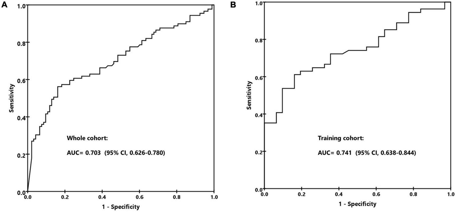 The receiver operating characteristic (ROC) curve for predicting bacterial infection by IL-6. (A) The whole cohort. (B) The training cohort.