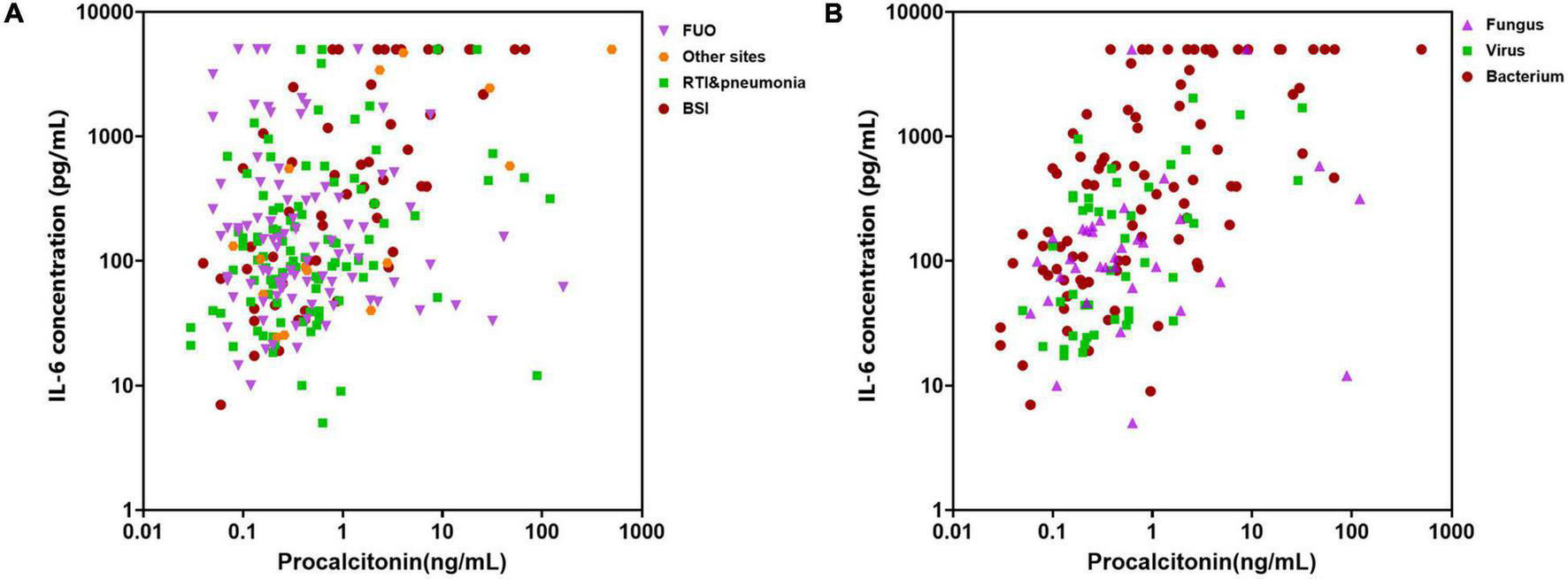 Distribution of cases with different infectious sites or pathogens based on procalcitonin (PCT) and interleukin (IL)-6 levels. (A) Distribution of cases with different infectious sites. FUO, fever of unknown origin; RTI, respiratory tract infection; BSI, bloodstream infection. (B) Distribution of cases caused by different microorganisms.
