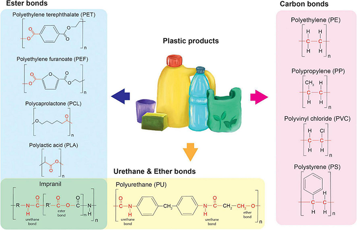 Carbon-carbon bonds are most commonly found in petrochemical-derived plastics like polystyrene (PS), polyvinyl chloride (PVC), polyethylene (PE), and polypropylene (PP). These plastics, and especially PE, are commonly used in single-use products (packaging, plastic bags, etc.) and contribute extensively to environmental pollution (PlasticEurope-Association of Plastics Manufacturers, 2020). In contrast to urethane bonds and ester bonds, carbon-carbon bonds are much more recalcitrant, and their degradation usually requires redox enzymes. These enzymes cleave the carbon-carbon bond in four steps: (1) oxidation and rearrangement of unstable oxidized intermediates; (2) collapse and rearrangement of radicals and/or cations; (3) oxygenation to obtain hydrolyzed cleavage products and finally; (4) oxygen activation requiring oxygen for substrate binding. The complex redox enzymes catalyzing these steps require metal ligands (Guengerich and Yoshimoto, 2018).