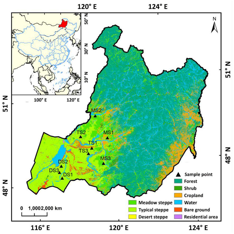 Location of the sampling sites. Each sampling site includes a paired grazing site and grazing exclusion site. MS1, MS2, and MS3 refer to the sampling sites in meadow steppe; TS1, TS2, and TS3 refer to the sampling sites in typical steppe; DS1, DS2, and DS3 refer to the sampling sites in desert steppe.