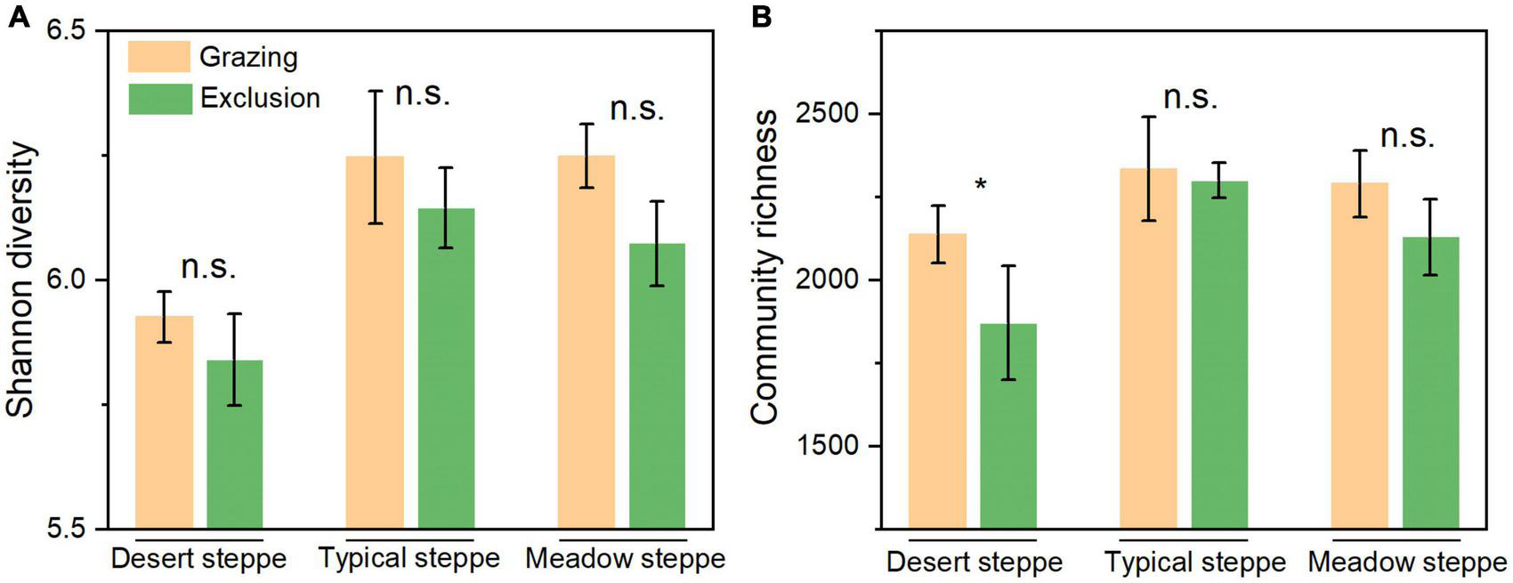 The bacterial α-diversity (A) based on Shannon index and community richness (B) based on Sobs index between grazing and exclusion sites in three types of grasslands. Error bars indicate standard errors (3 replicate sites). “*” means significant difference (P < 0.05) between grazing and exclusion sites. “n.s.” means non-significant.