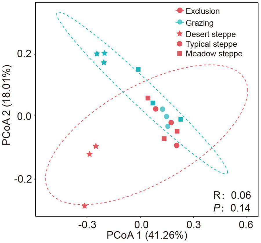 Bacterial community structure assessed by β-diversity patterns using the principal coordinate analysis plots of Bray–Curtis distances. Different color represents exclusion or grazing soils and shape represents grassland types: desert steppe, typical steppe, and meadow steppe. ANOSIM similarity analysis was used to test the significance between groups.