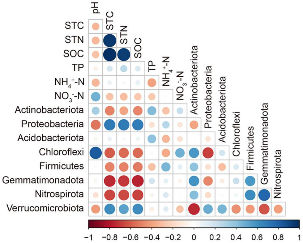 Correlation between soil properties and the major bacterial phyla. Circle size and color represent the Pearson correlation coefficient.