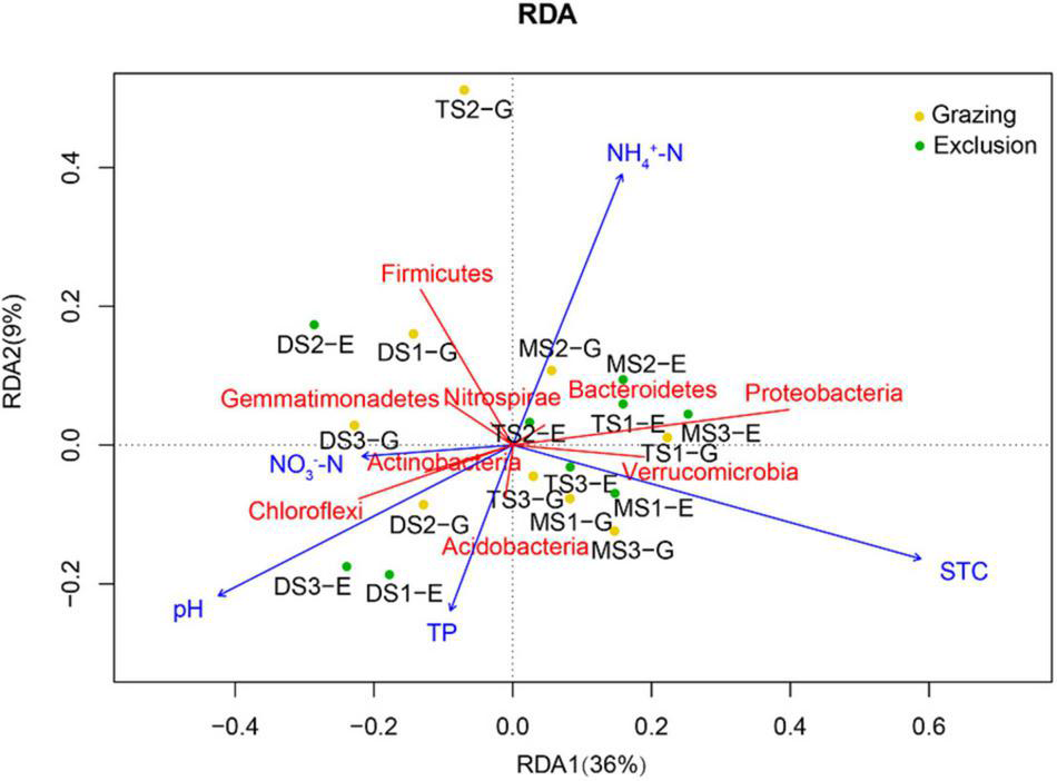 The correlations between main soil chemical properties and bacterial α-diversity were not significant in the three types of grasslands of grazing exclusion and grazing soils (Supplementary Table 3). The correlations between soil properties and major bacterial phyla are shown in Figure 5. The relative abundance of Proteobacteria and Verrucomicrobia was significantly positively correlated with the content of STC, STN, and SOC. The relative abundance of Actinobacteria, Choloflexi, Firmicutes, Gemmatimonadota, and Nitrospirota was significantly negatively correlated with STC, STN, and SOC. The pH was significantly correlated with the relative abundance of Chloroflexi. In addition, RDA was conducted to investigate the effect of soil chemical properties on the composition of the bacterial community (Figure 6). The adjusted R2 of the RDA model was 0.498, which means that 49.8% of the total variance of the bacterial community can be explained by the selected soil chemical properties in the grazing and exclusion soils. Among them, STC played a leading role in affecting the distribution of the bacterial community, followed by pH, NH4+–N, TP, and NO3––N.