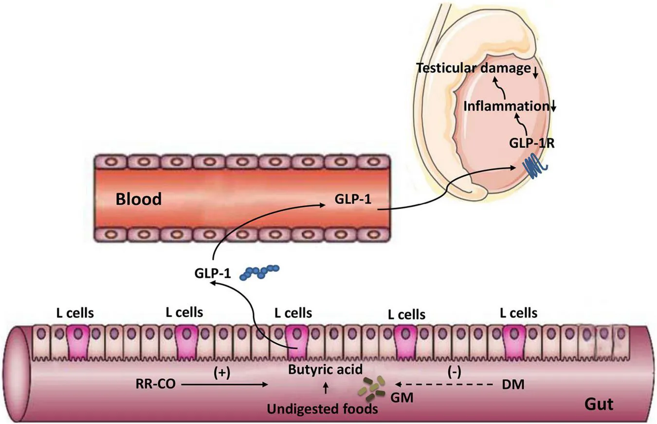 In general, the results from the current study suggested that the herb pair RR-CO improves T2DM-induced reproductive complications, such as lowering FBG, improving pathological damage to the spermatogenic tubules, alleviating the inflammation in the testis, and increasing the live sperm rate, by modulating the composition and function of the GM. The ameliorating effect of RR-CO on testicular inflammation may be associated with the regulation of butyric acid/GLP-1/GLP-1R pathway mediated by GM (Graphical abstract).