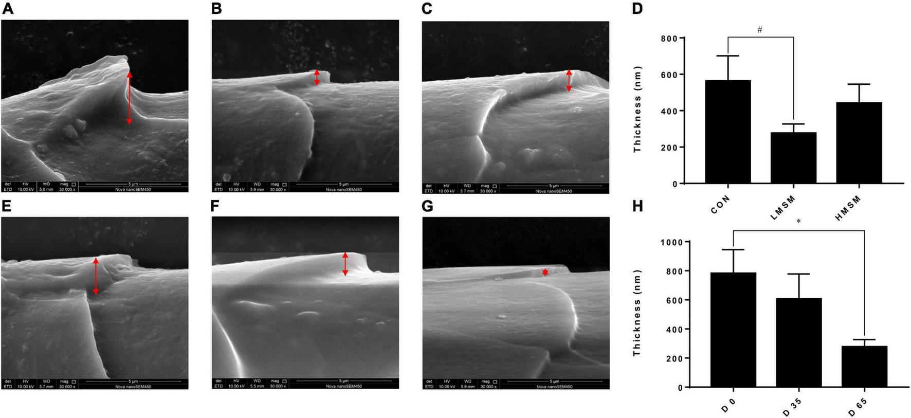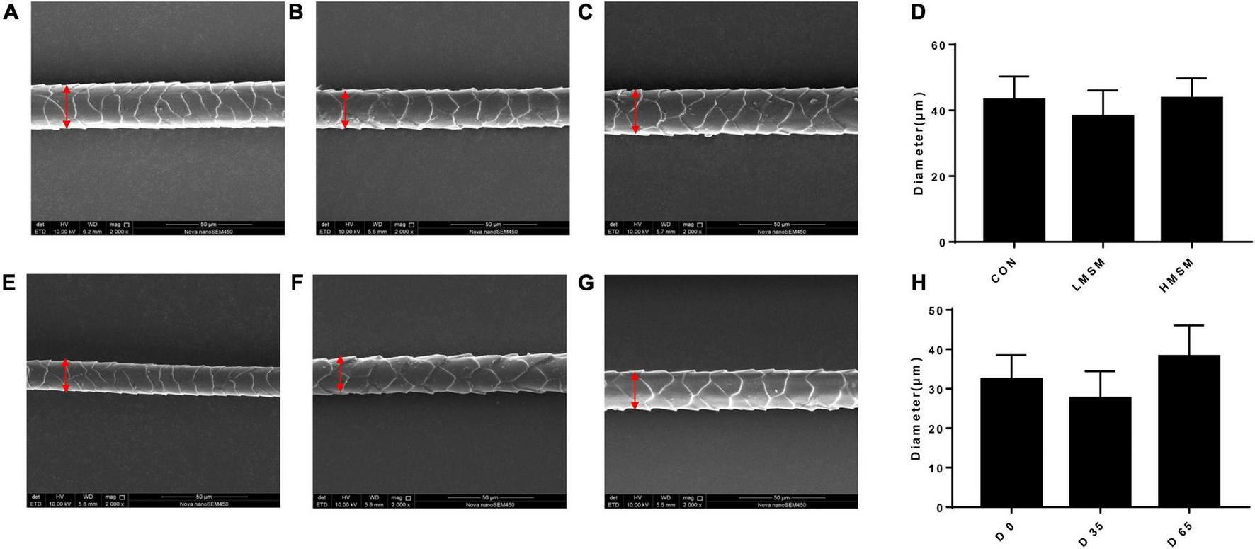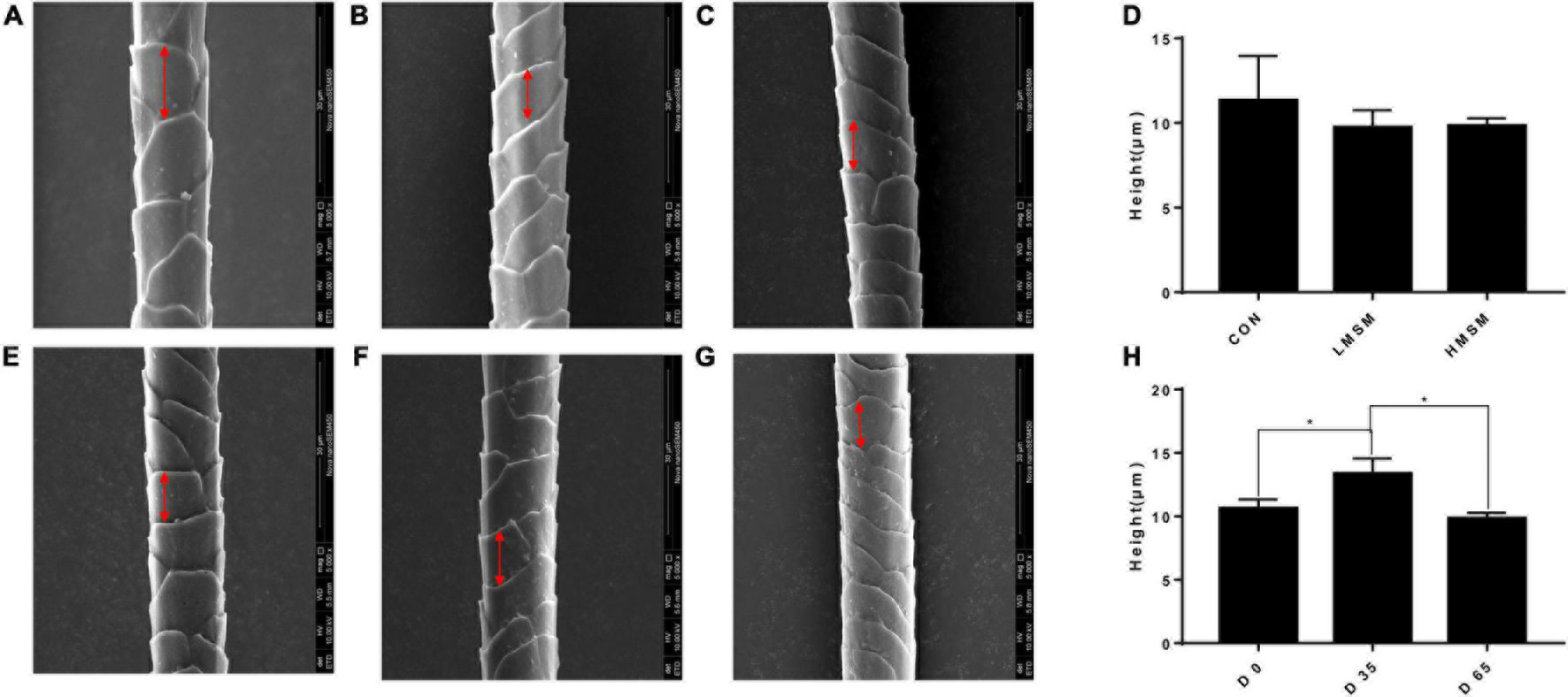 Hair samples were collected on d 0, d 35, and d 65 for measurement of length and scale structure, the content of element, sulfur-containing amino acids, and keratin. The hair on the back of all kittens was shaved on d 0, and the length of the new hair at the same position was observed on d 35 and d 65. The hair scoring was conducted on d 0, d 35, and d 65 under the same lighting conditions and on the same observation table. The five observers were blinded to the treatment individual cat received. The method described by Rees et al. (2001) was adopted for the evaluation of hair scores (Rees et al., 2001). Briefly, all samples were scored in 5 increments using the following scale: 1 = dull, coarse, dry; 2 = medium reflective, medium soft; 3 = highly reflective, very soft; 4 = medium soft, medium greasy; and 5 = very greasy, where 1 ≤ HS ≤ 2 dry, 2 < HS < 4 ideal, and 4 ≤ HS ≤ 5 greasy (Figure 1). Hair samples were measured for the structural characteristics of the scale layer, including thickness, the height of the scale, and diameter of the hair by scanning electron microscope (SEM, JSM-6380LV, JEOL Ltd.). Because the amount of hair collected was insufficient, six repetitions were performed in each group. In addition, three samples were randomly selected from each group for the measurement of keratin, amino acids, especially the sulfur-containing amino acids, and content of S, O, and C by semi-quantitative detection analysis using an X-ray energy spectrometer (Genesis 2000, EDAX Inc.).