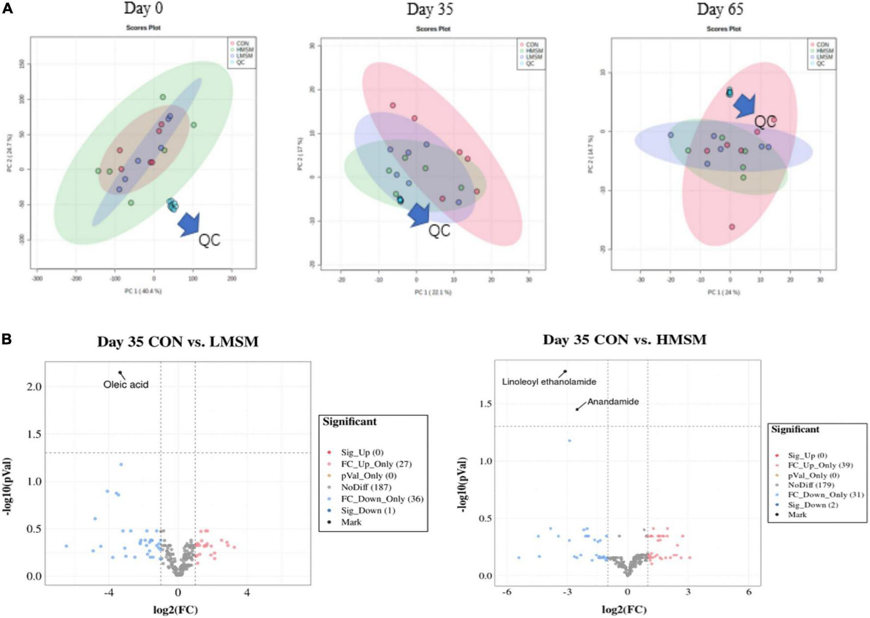 SPSS 26.0 and GraphPad Prism 8.0 software were used for statistical analysis and graphical presentation. One-way analysis of variance (ANOVA) followed by a least-significant difference (LSD) multiple range test was used to determine the statistical significance of multiple comparisons in the experiment. Repeated measures ANOVA was employed to analyze the data over three time points. For gut microbiota, operational taxonomy units (OTUs) with similarity ≥ 97% were chosen for the α-diversity analysis, and the principal coordinate analysis (PCoA) and box plot were selected to evaluate the β-diversity. Microbiota-based biomarker discoveries were done with Student’s t-test and adjusted using the Benjamini–Hochberg test to get Q-values. Clustered heatmap with the rank abundance plot of bacterial genera was plotted at https://magic.novogene.com. To preliminarily screen the differential metabolites, we compared the metabolites in the MSM groups with the CON group (P < 0.05, FC > 2), and the P-values were adjusted by FDR (FDR < 0.1). The advanced volcano plot was constructed using the OmicStudio tools at https://www.omicstudio.cn/tool. Variability in the data was expressed as the standard error of the mean. Significance was considered with a P < 0.05 and tendency at 0.05 ≤ P < 0.10.