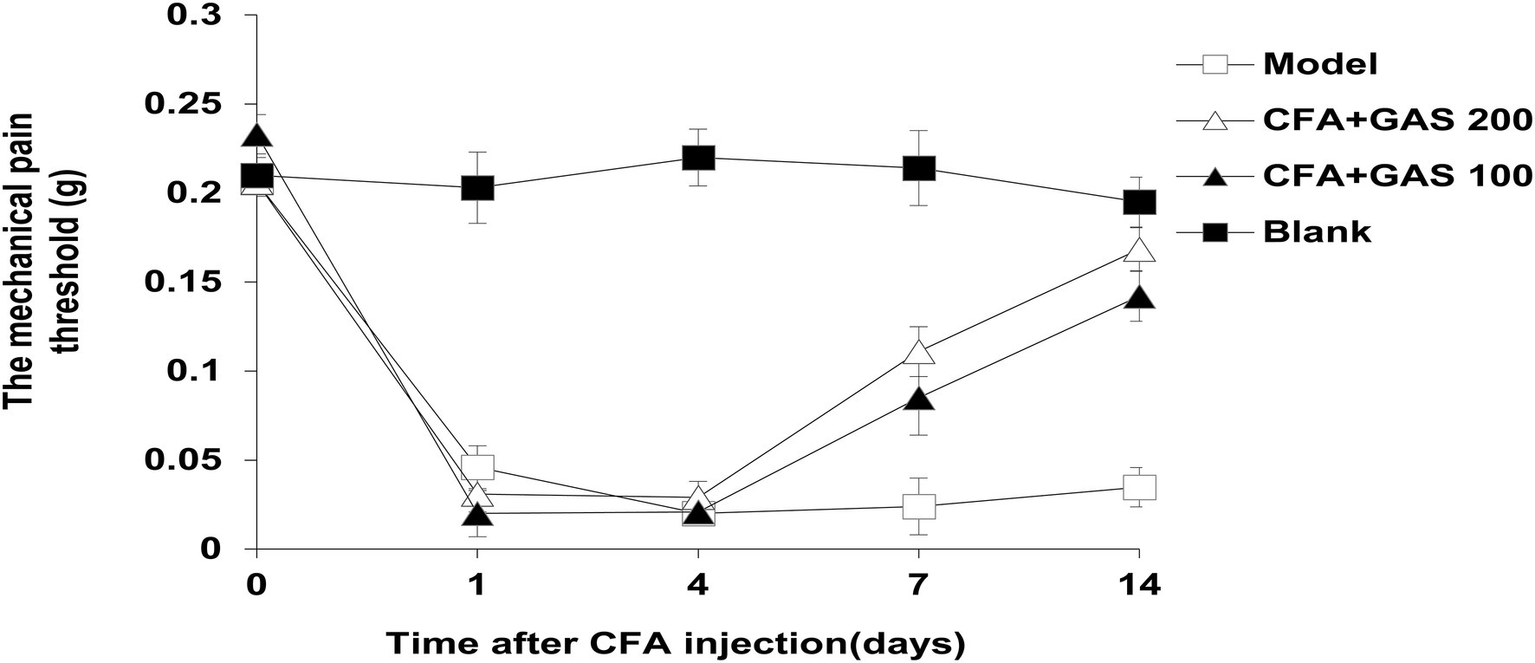 A total of 10 μl CFA (50%) was injected intraplantar subcutaneously into the left hindpaws of mice to established chronic peripheral inflammatory pain. In the control group, the same volume of SAL was injected into the hindpaws of mice. GAS was dissolved in saline before use. The mice were intraperitoneally injected with GAS (100 and 200 mg/kg) after CFA insult GAS or saline was used repeatedly in mice once a day for 2 weeks.