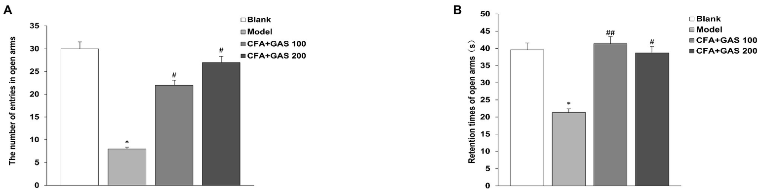 Anxiety-like behaviors of animal are determined by EPMT and OFT. In EPMT, after CFA injection, the number of entries in open arms and retention times of open arms significantly decreased. Moreover, compared with the model group, the number of entries in open arms and retention times of open arms in the GAS-treated group were increased (Figures 4A,B). In the OFT, compared with the blank group, the time spent in the central area decreased in the model group, while the GAS (100 and 200 mg/kg) reversed the reduction caused by CFA (Figure 5). The results show that GAS attenuated CFA-induced anxiety-like behavior.