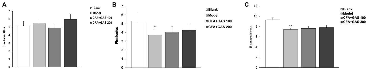 Effect of GAS on jejunal microbiota. (A) Effect of GAS on Lactobacillus species. (B) Effect of GAS on Firmicutes species. (C) Effect of GAS on Bacteroidetes species. **p < 0.01 compared with blank group.