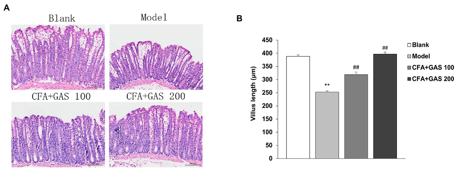 The effects of GAS jejunal morphological characteristics and microbiota are shown in Figures 7, 8, respectively. The jejunum villus length was decreased in the model group, whereas the villus length was increased in GAS groups (100 and 200 mg/kg). In addition, CFA decreased the Bacteroidetes and Firmicutes species without affecting Lactobacillus species. However, the jejunal microbiota did not change after GAS treatment.