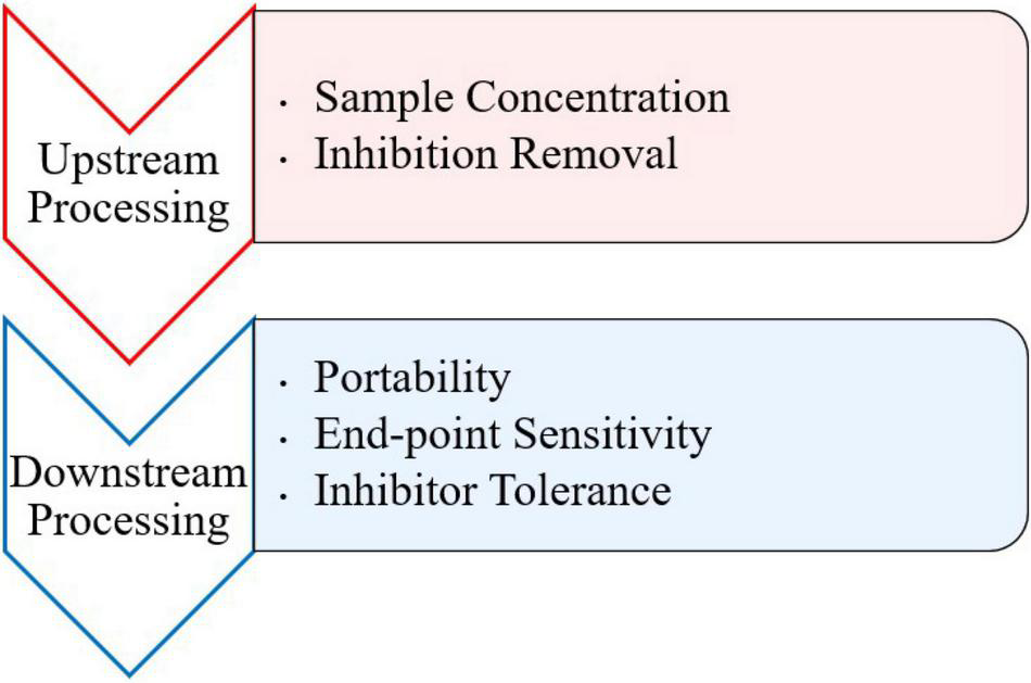Inhibitory substances present in food and environmental samples pose a problem for detection of viruses via PCR and other molecular methods. Numerous components in clinical, environmental, and food samples have been characterized as inhibitors for PCR (Thompson et al., 2014). Such inhibitors may include bile salts, complex polysaccharides, collagen, heme, humic acid, proteinases, and calcium ions (Bessetti, 2007; Suther and Moore, 2019). Although there are a variety of isothermal methods to use, most typically contain an RNA/DNA extraction step before amplification to prevent background noise and disruption of the amplification reaction from inhibitors (Stals et al., 2012). However, this requires more specialized equipment and can compromise the portability of any downstream detection assay at point of care. More recently, a few studies have observed the difference between using traditionally extracted and crudely extracted samples prior to amplification. These approaches typically involve crude extraction steps, like heating the sample to break down viral particles and release genomic nucleic acid. Furthermore, research should be conducted on effects of inhibitors during both upstream and downstream processing of isothermal assays (Figure 1).