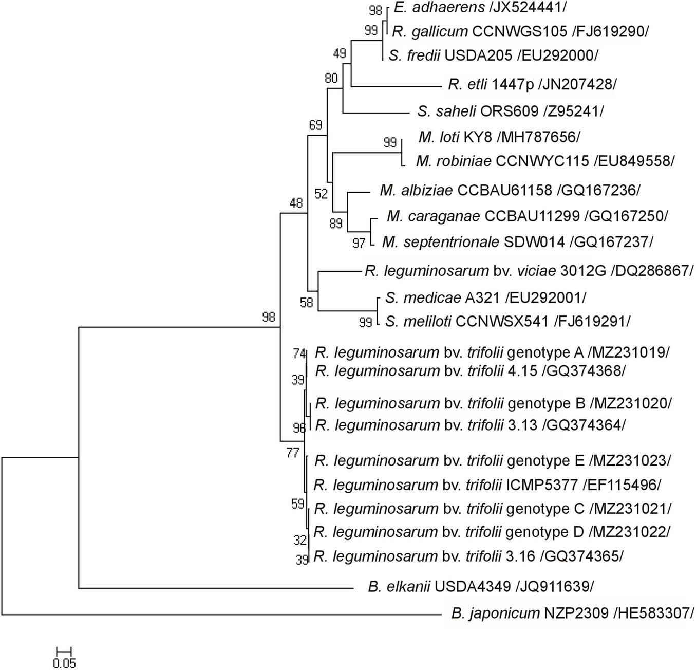 The phylogenetic Neighbor Joining tree based on 416-bp nodA gene sequences showing the relationship of R. leguminosarum bv. trifolii genotypes (A–E) and reference strains (the GenBank database). Numbers at nods indicate levels of bootstrap support based on an analysis of 1,000 resampled data sets. Accession numbers of reference strains representative of the studied strains are shown in parentheses. The scale bar indicates the number of substitutions per site.