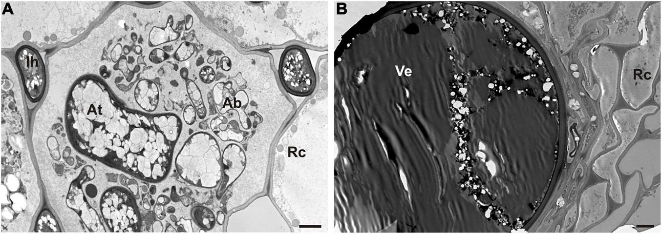 Nodules of different size and stages of development were collected from T. repens plants grown on the waste heap in Bolesław and the reference area in Bolestraszyce. The nodules were fixed according to Karnovsky (1965) and Łotocka et al. (1997) for 24-h at 21°C ± 0.5 and air pressure of –0.4-kGcm–2. Subsequently, nodules were post-fixated in 1% OsO4 for 4-h at 4°C, dehydrated in increasing concentrations of ethanol, and embedded in glycid ether 100 epoxy resin (SERVA) according to Sujkowska-Rybkowska et al. (2012). Blocks were sectioned using microtomes (Jung RM 2065 and Ultracut UCT, Leica). Semithin sections of epoxy resin-embedded nodule tissue blocks were stained with methylene blue and azur A, and examined under a light microscope (Olympus-Provis, Japan). Next, thin sections were collected on copper grids, contrasted with uranyl acetate followed by lead citrate for 1 min, and examined under a TEM Morgagni 268D (Philips, Netherlands).