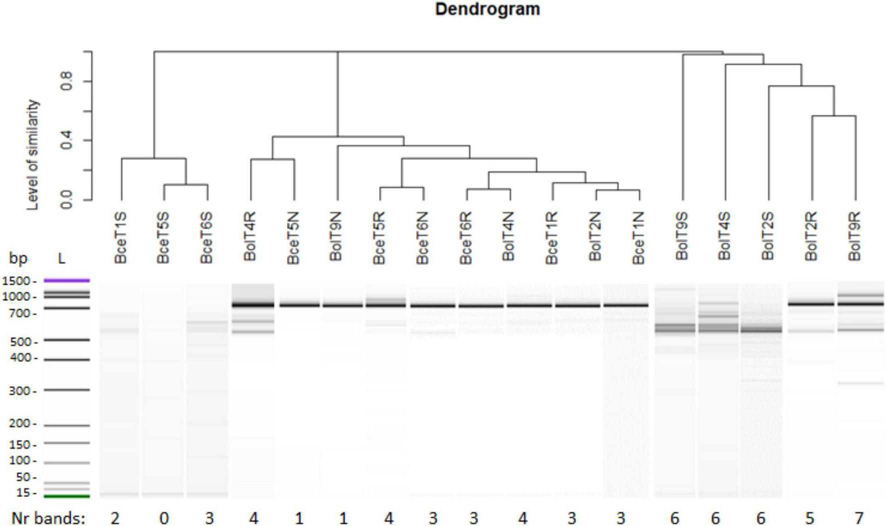 Total DNA was extracted from roots and nodules of six T. repens plants collected from the metal-polluted waste heap and the reference area according to Valledor et al. (2014), and from white clover rhizosphere using the MO BIO PowerSoil protocol (Qiagen). A determination of fungal genetic diversity was performed using ARISA (automated rRNA intergenic spacer analysis) fingerprinting based on an analysis of variable size of the 18S-28S rRNA internal transcribed spacer (ITS) region that, in eukaryotes, is divided into two subregions ITS1, involving 18S-5.8S rRNA genes and ITS2 comprised of 5.8S-28S rRNA genes (Ranjard et al., 2001; Johnston-Monje and Lopez Mejia, 2020). ITS1-5.8S-ITS2 region amplification was performed in a final volume of 25-μL, consisting of a 2.5-μL Fast-Start HF Reactive Buffer (0.9-mM MgCl2) (FastStart High Fidelity PCR System, Roche, Sigma Aldrich), 0.5-μL PCR grade nucleotide mix (100-μM of each dNTP), 0.25-μL a Fast-Start HF Enzyme Blend (1.25 U), 20.25-μL nuclease-free water, 0.5-μL DNA as a template, and 0.5-μL each of the fluorescence-labeled primers (0.04-μM), representing consensus sequences found at the 3′ end of the 18S gene for 2234C (5′-GTTTCCGTAGGTGAACCTGC-3′) and with the 5′ end of the 28S gene for 3126T (5′-ATATGCTTAAGTTCAGCGGGT-3′) (Biolegio, Netherlands). Amplification was performed in conditions as follows: initial denaturation at 94°C for 3 min, 34 cycles of denaturation at 94°C for 1 min, annealing at 55°C for 45 s, and elongation at 72°C for 1 min, and a final elongation at 72°C for 7 min. Automated electrophoresis of amplified intergenic spacer region products was performed according to the Agilent DNA 1000 assay protocol. Post-PCR products were added to the Agilent DNAchip (On-Chip Electrophoresis, Agilent Technologies, United States) for a subsequent analysis in the Agilent 2100 Bioanalyzer, equipped with DNA 2100 Expert software. The genetic diversity of fungi was determined with the R × 64 version 3.6.2 program and the StatFingerprints package (Michelland et al., 2009).