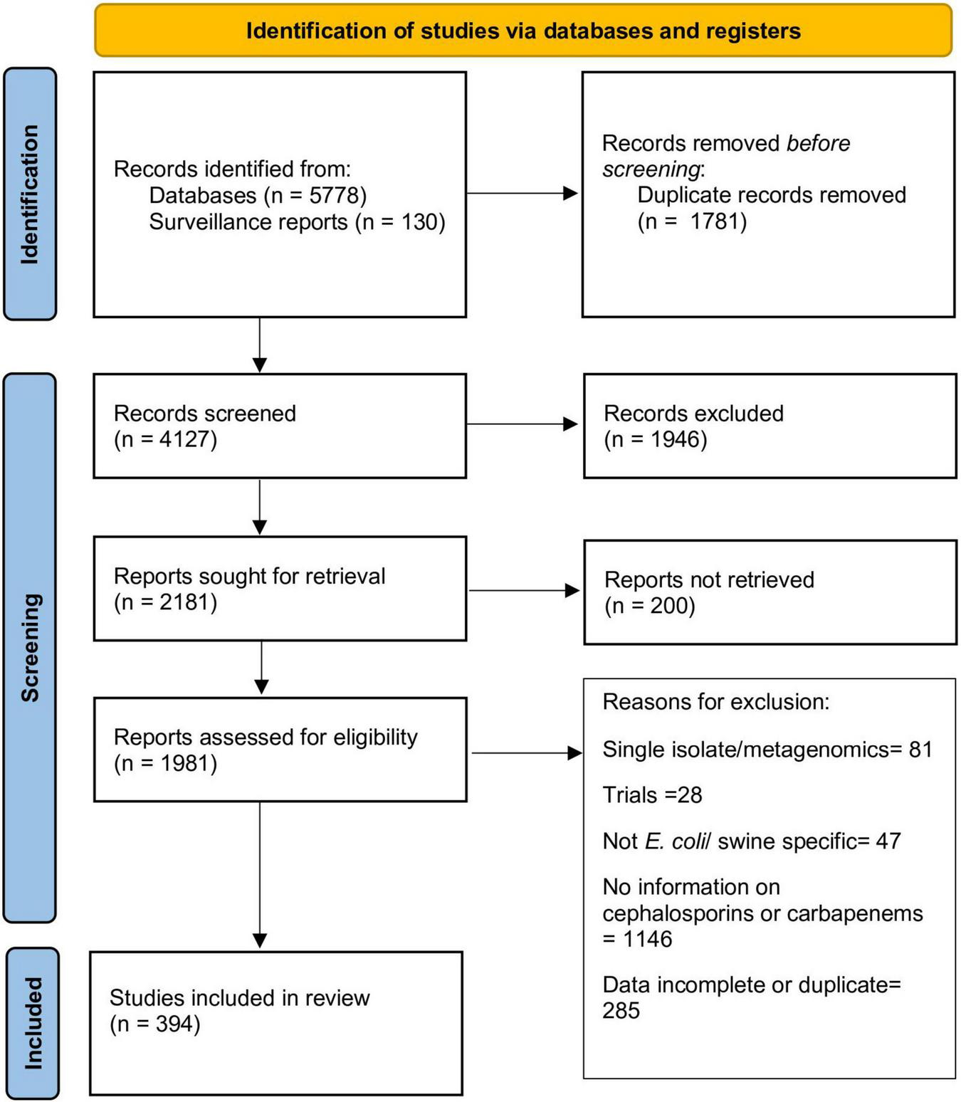 Retrieved records were first screened for inclusion if there was a mention of AMR, E. coli or Enterobacteriaceae, and livestock in title and/or abstract. The selected full-length articles were then downloaded and data was collected from articles if there was data on occurrence of phenotypic AMR against 3GCs or carbapenems in E. coli collected from pigs. Articles were excluded if: