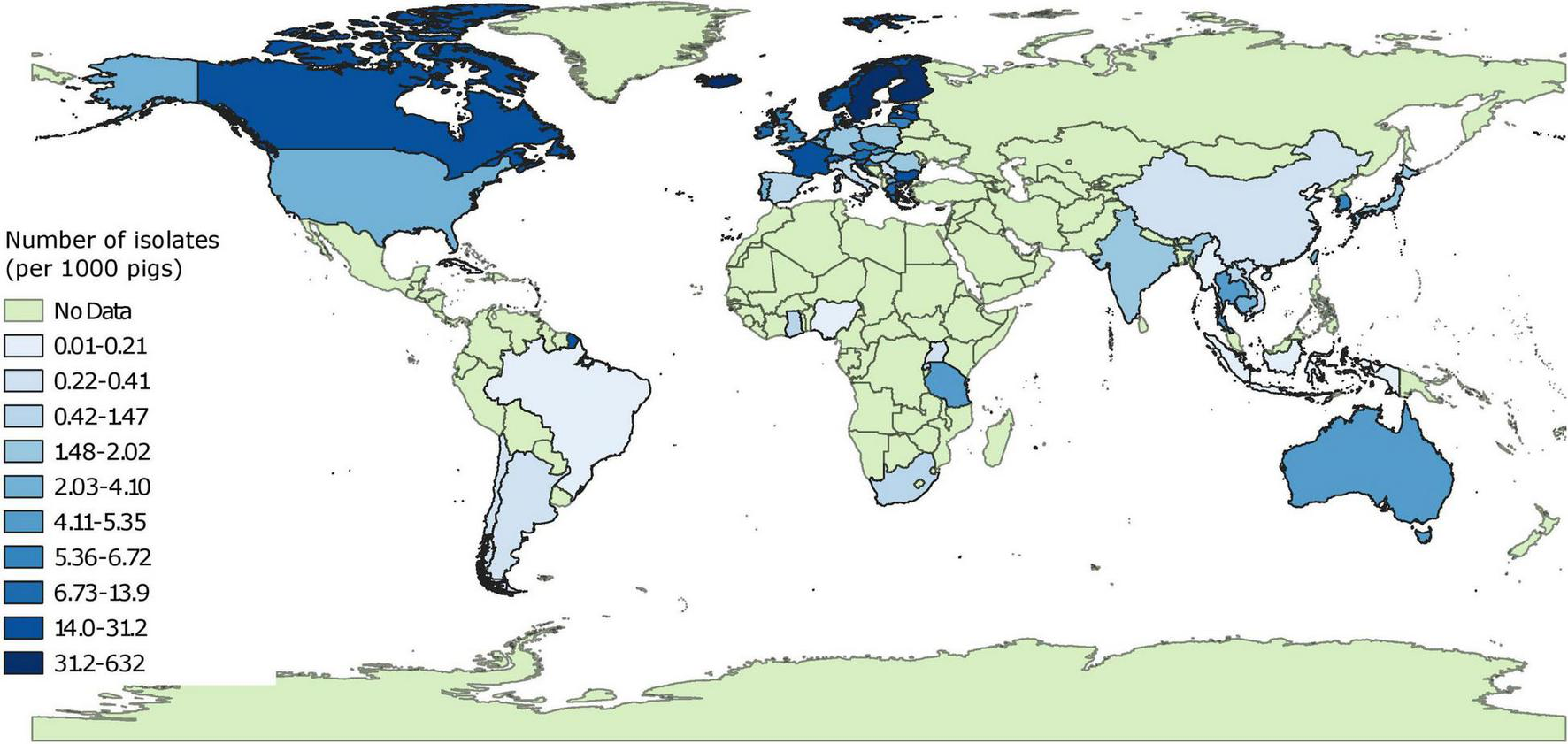 Global distribution of sampling indices (number of isolates characterized for phenotypic resistance per 1,000 pigs). “No data” implies that there were no isolates of interest reported and does not mean that there were no pigs in particular countries.