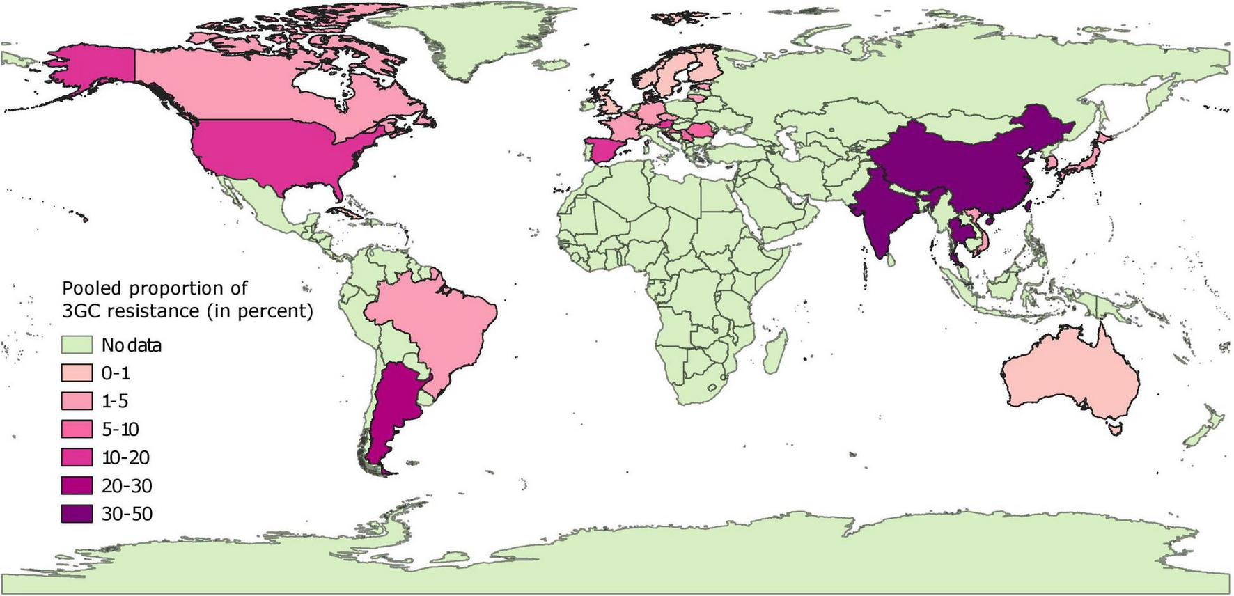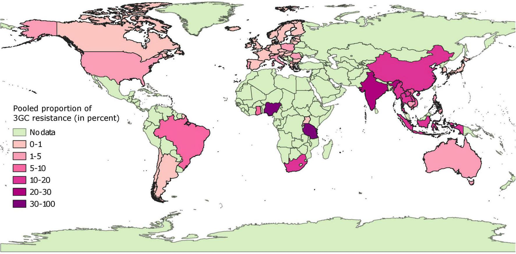 In contrast to the results above, the pooled proportion estimates from African and Asian countries were highly variable. Very low (<1%) pooled proportion estimates of 3GC resistance were estimated for Japan, South Korea, Rwanda, and Uganda. Low percentage of isolates were resistant to 3GCs in four countries (Cambodia, 2%; Philippines, 5%; Vietnam, 8%; and Ghana, 7%). In contrast, for other countries estimates of pooled proportion of 3GC resistance ranged between moderate (Laos, 12%; Indonesia, 12%; China, 16%; Myanmar, 18%; Thailand, 20%; and South Africa, 19%), high (India, 24% and Tanzania, 37%), and extremely high (Nigeria, 91%). These estimates were either statistically heterogeneous or based on a single data-point, except for Japan, Laos, and Uganda.