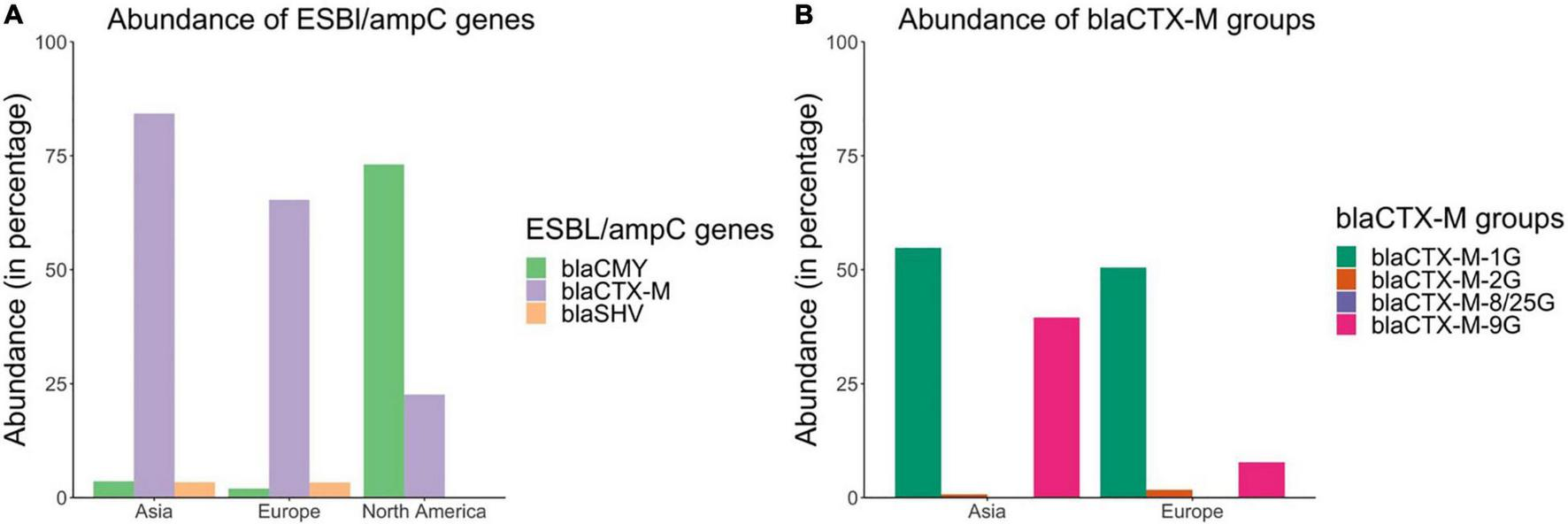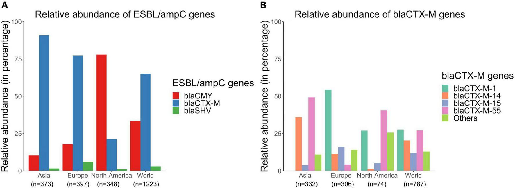 Relative abundance of ESBL/ampC genes were estimated as the ratio of isolates carrying a particular bla gene family (e.g., blaCMY) divided by total number of isolates carrying blaCMY,blaCTX–M and/or blaSHV. Furthermore, relative abundance of subclasses of blaCTX–M genes were estimated as the ratio of isolates carrying a particular blaCTX–M subclass gene family (e.g., blaCTX–M–15) divided by total number of isolates carrying blaCTX–M genes. Relative abundances of ESBL/ampC genes (blaCMY,blaCTX–M, and blaSHV) and blaCTX–M subclasses at a global and continent level were plotted using library ggplot2 version 3.3.5 (Wickham et al., 2021).