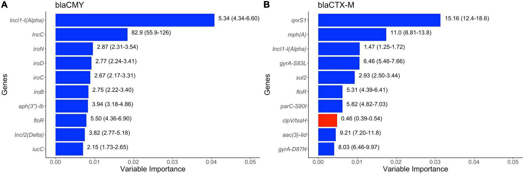 Random Forest models were built to characterize genetic features (virulence factors, plasmid replicons, chromosomal mutations, acquired resistance genes, and plasmid replicon types) that could predict the presence of blaCMY and blaCTX–M genes. Two models were built separately for blaCMY and blaCTX–M genes (dependent variables). Models were not built for blaSHV isolates as they were too few in numbers to make reasonable models that can be generalized at a local or global scale. Only one of the perfectly correlated genetic features (r > 0.99) was retained for further analysis using library caret version 6.0-90 (Kuhn et al., 2021). The dataset was divided into training (65% of the dataset) and testing (35% of the dataset) data based on stratified random sampling in order to retain the same proportion of results for the dependent variables in these split datasets (presence of blaCMY or blaCTX–M depending on the model) (library caTools version 1.18.2) (Tuszynski, 2021). These models were first built for imbalanced training datasets using quantile-classifier algorithm (O’Brien and Ishwaran, 2019) in library RandomForestSRC (version 2.14.0) with the following settings: mtry = 25, number of trees = 12,000, split rule = AUC, block size = 100. Model performances were evaluated using geometric means. Training models were used to identify the top variables (i.e., variables of importance) that can predict blaCMY or blaCTX–M genes in testing data using default settings (library RandomForestSRC version 2.14.0) (Ishwaran and Kogalur, 2021). The top 10 variables of importance were extracted and plotted using library ggplot2 version 3.3.5 (Wickham et al., 2021). Unadjusted odds ratios were also estimated for the top 10 variables of importance to estimate an effect size and directionality and for ease of interpretation.