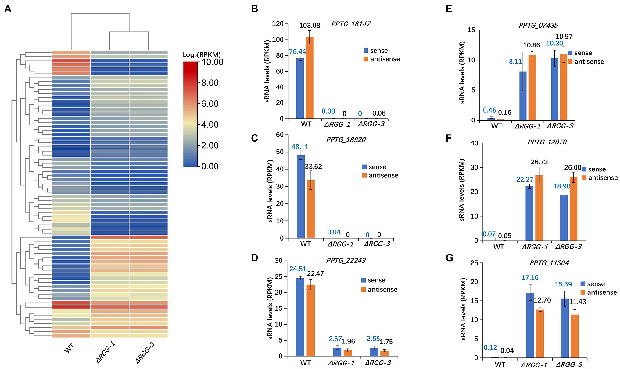 Significant changes in accumulation of 25–26 nt sRNAs homologous to70 cytoplasmic effector genes in mutants PpAGO3ΔRGG1 and PpAGO3ΔRGG3 compared to the wild-type P. parasitica. (A) Heatmap for 25–26 nt sRNA accumulation in wild-type, and mutants PpAGO3ΔRGG1 and PpAGO3ΔRGG3. The accumulation of 25–26 nt sRNAs was increased for those associated with 24 RXLR and 17 CRN effector genes, and was reduced for those associated with 12 RXLR and 17 CRN effector genes in mutants PpAGO3ΔRGG1 and PpAGO3ΔRGG3. The color represents the transformation value of log2 (RPKM). (B-G) The expression levels of sense and antisense 25–26 nt sRNAs associated with six representative effector genes in wild-type, and mutants PpAGO3ΔRGG1 and PpAGO3ΔRGG3. Both sense and antisense 25–26 nt sRNAs associated PPTG_18147(B), PPTG_18920(C), and PPTG_22243(D) were highly accumulated in the wild-type but reduced dramatically in mutants PpAGO3ΔRGG1 and PpAGO3ΔRGG3. On the contrary, the sense and antisense 25–26 nt sRNAs associated with PPTG_07435(E), PPTG_12078(F), and PPTG_11304(G) were significantly increased in PpAGO3ΔRGG1 and PpAGO3ΔRGG3 mutants compared to the wild-type.