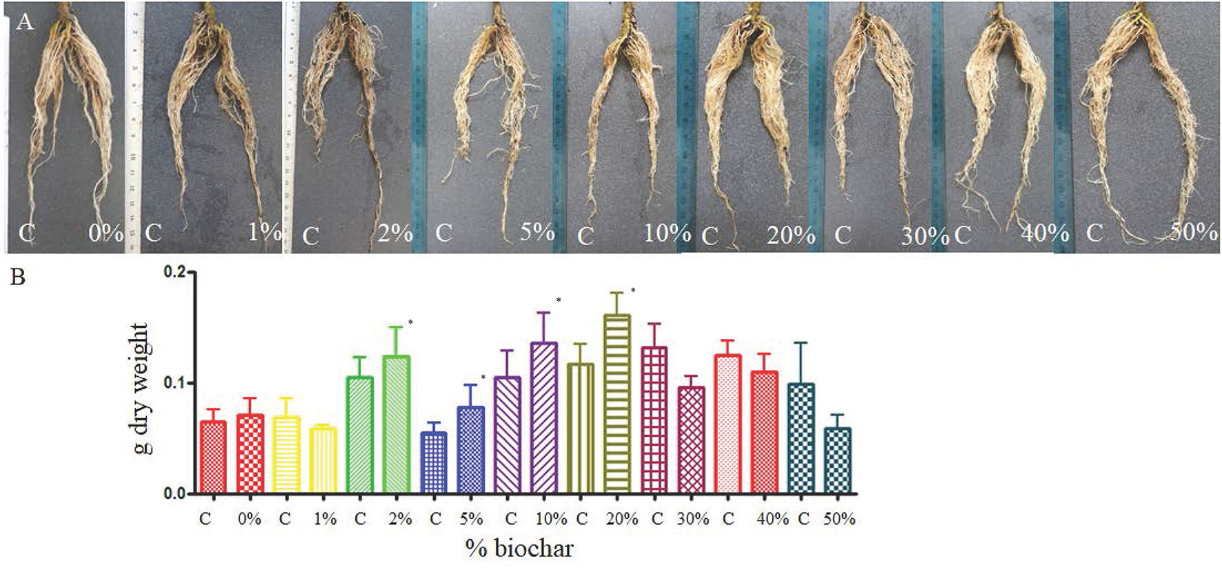 Root of tomato seedlings (A) grown half in peat (C, control) and half on a substrate containing different concentrations of biochar (from 0 to 50%) in a split pot test. (B) Dry weight of the same roots grown half in peat (C) and half in biochar at different concentrations. *p < 0.05.
