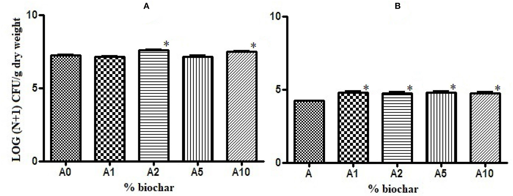 Biochar showed a positive effect on the growth of rhizobacteria present in the rhizosphere of the tomato seedlings. The total bacterial load was significantly higher in substrates with 2 and 10% of biochar (A2 and A10) than in the control substrate (A0), (Figure 2A), and the charge of sporogenic bacteria significantly increased in all the biochar substrates (Figure 2B).