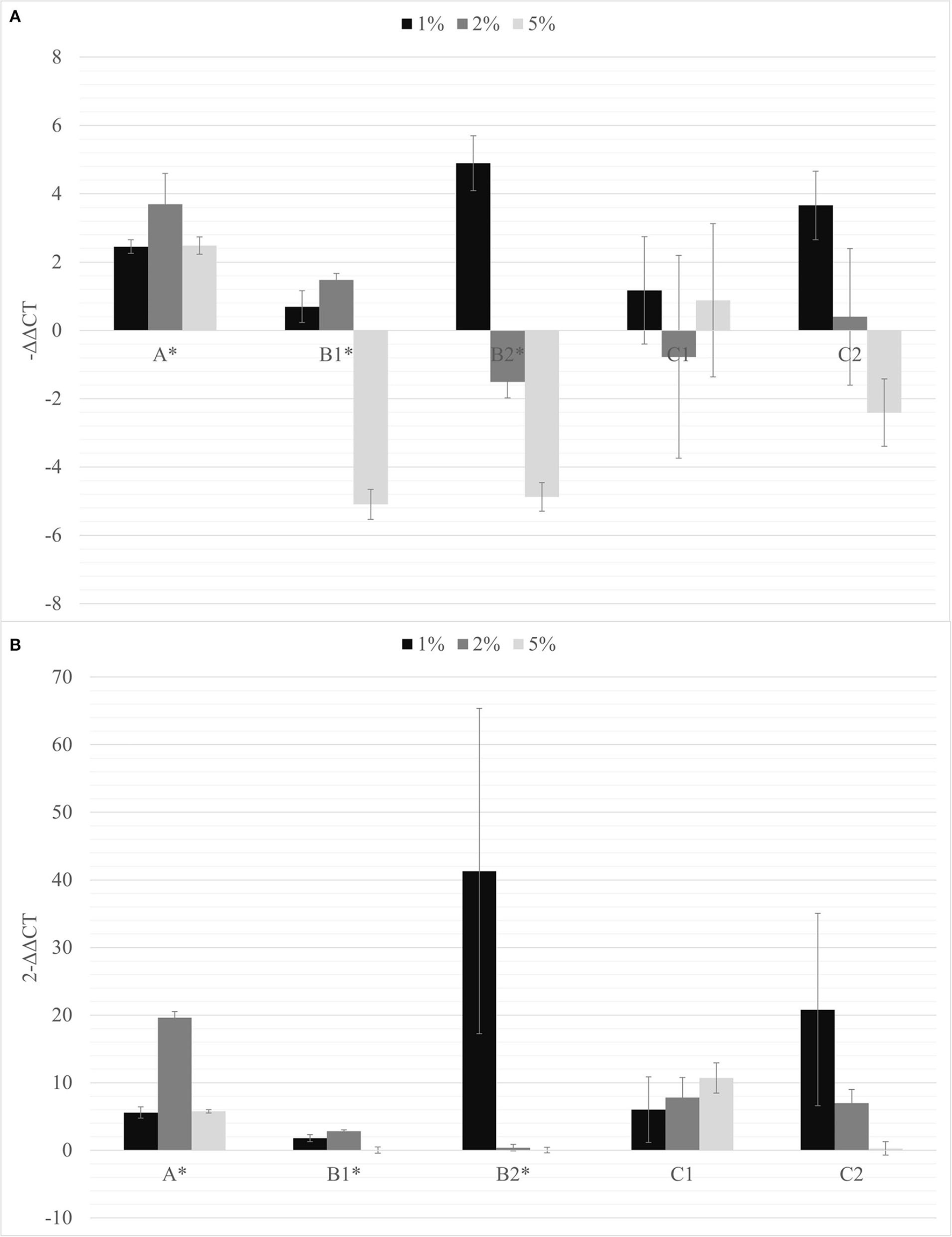 The –ΔΔCt (A) and fold change in PSTVd replication (2−ΔΔCt) (B) mean values obtained for all the biochar percentages (1% black; 2% dark gray; 5% light gray) are reported. *p < 0.05.