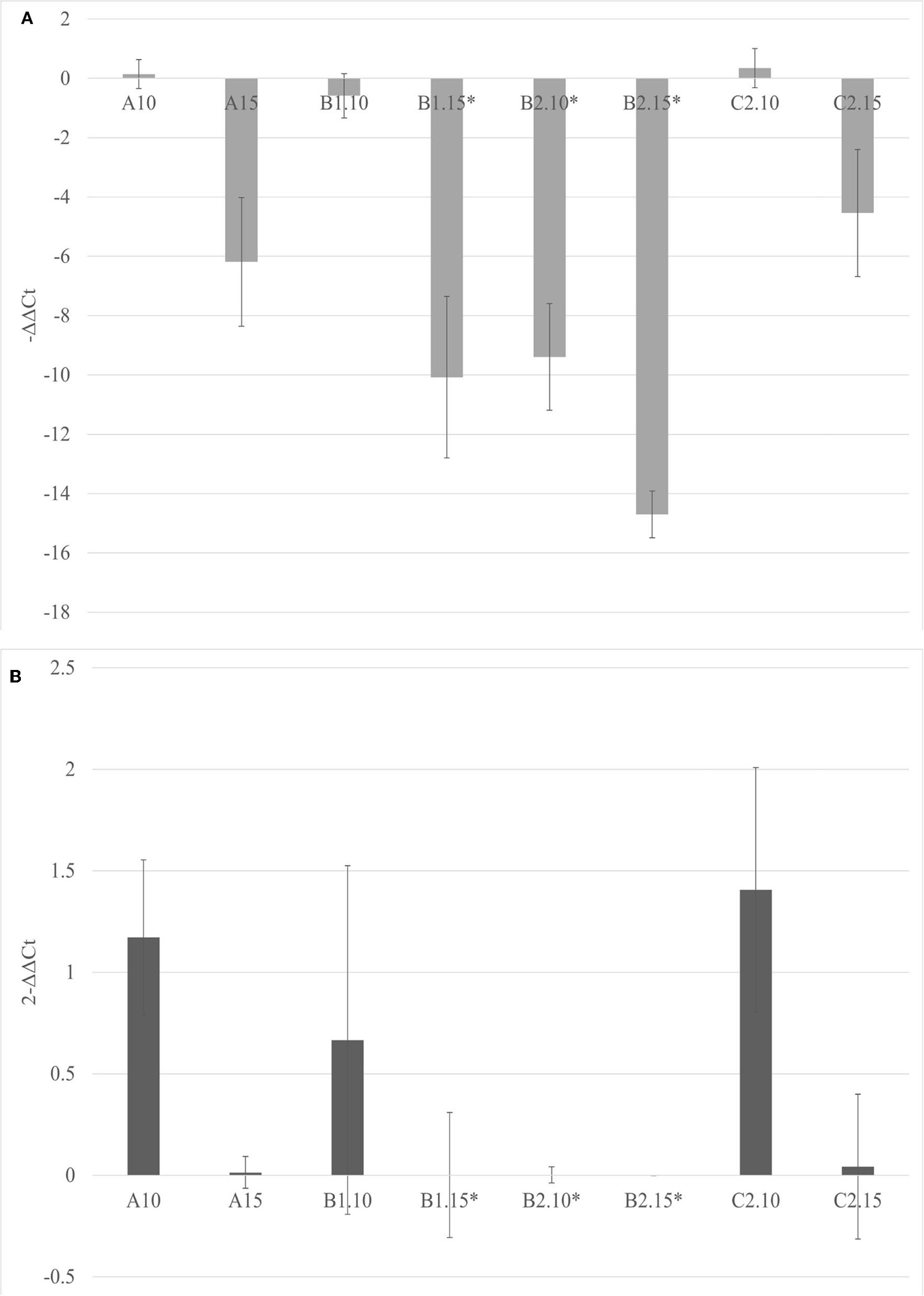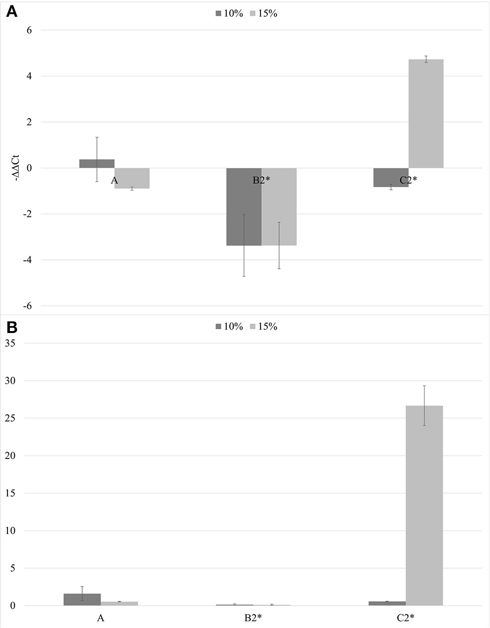 The –ΔΔCt results (A) and fold change in TSWV replication (2−ΔΔCt) (B) mean values obtained for all the theses (10% in gray and 15% in light gray). *p < 0.05.
