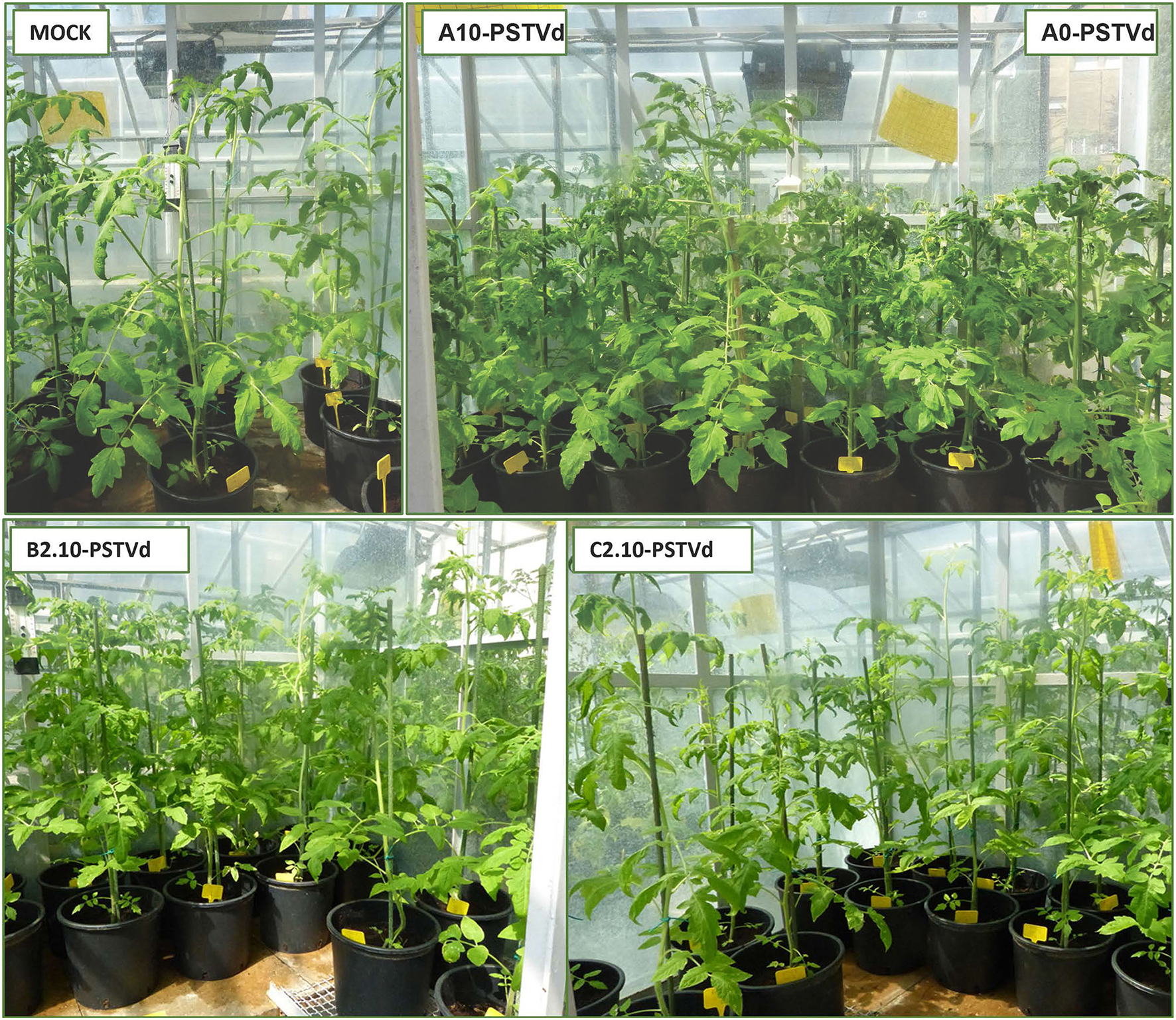 PSTVd symptoms observed on tomato plants growth on different substrates: MOCK-controls inoculated with buffer only; A10-PSTVd, A0-PSTVd showing severe symptoms: shortening of internodes, bunched leaves and shoots on the top of the plants, and stunted growth; B2.10 and C2.10-PSTVd showing mild symptoms: curling leaves and distortion.