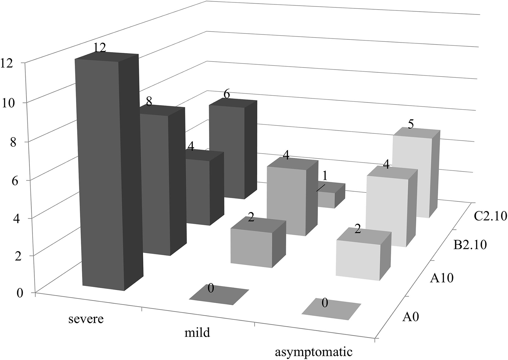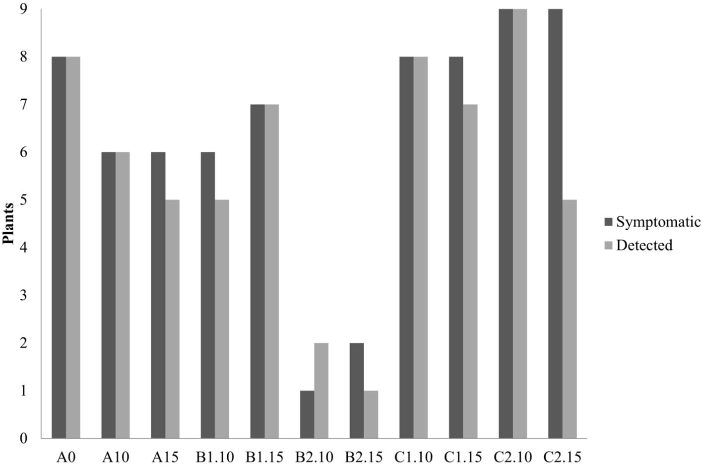 PSTVd symptoms modulation (no. of plants evaluated according to the expression of symptoms for each substrate in this study). Black, severe symptoms; dark gray, mild symptoms; light gray, no symptomatic plants.
