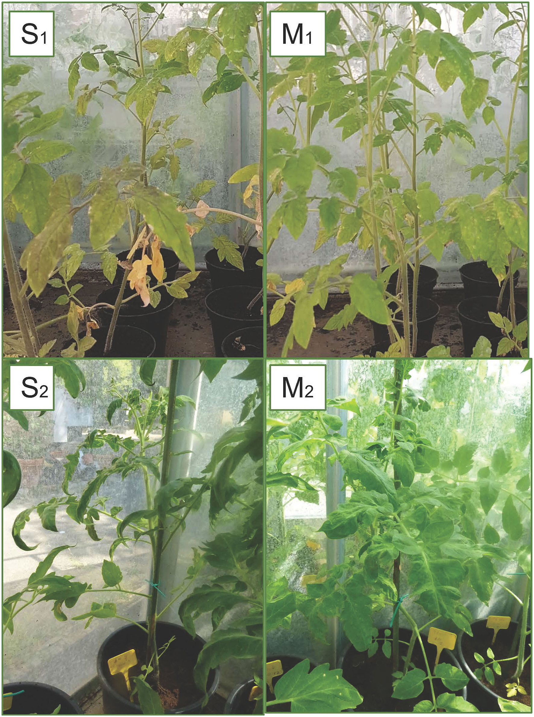 Symptoms of TSWV observed in plants grown on different substrates: severe symptoms with typical necrotic spots and bronzing of leaves (S1) and reduction in the plants growth (S2) in A0 (only peat); mild symptoms with chlorotic spots or chlorotic leaves (M1) and middle symptoms (M2) observed in substrates with biochar (A10 and B2.10) (with peat, biochar, and Trichoderma spp.).