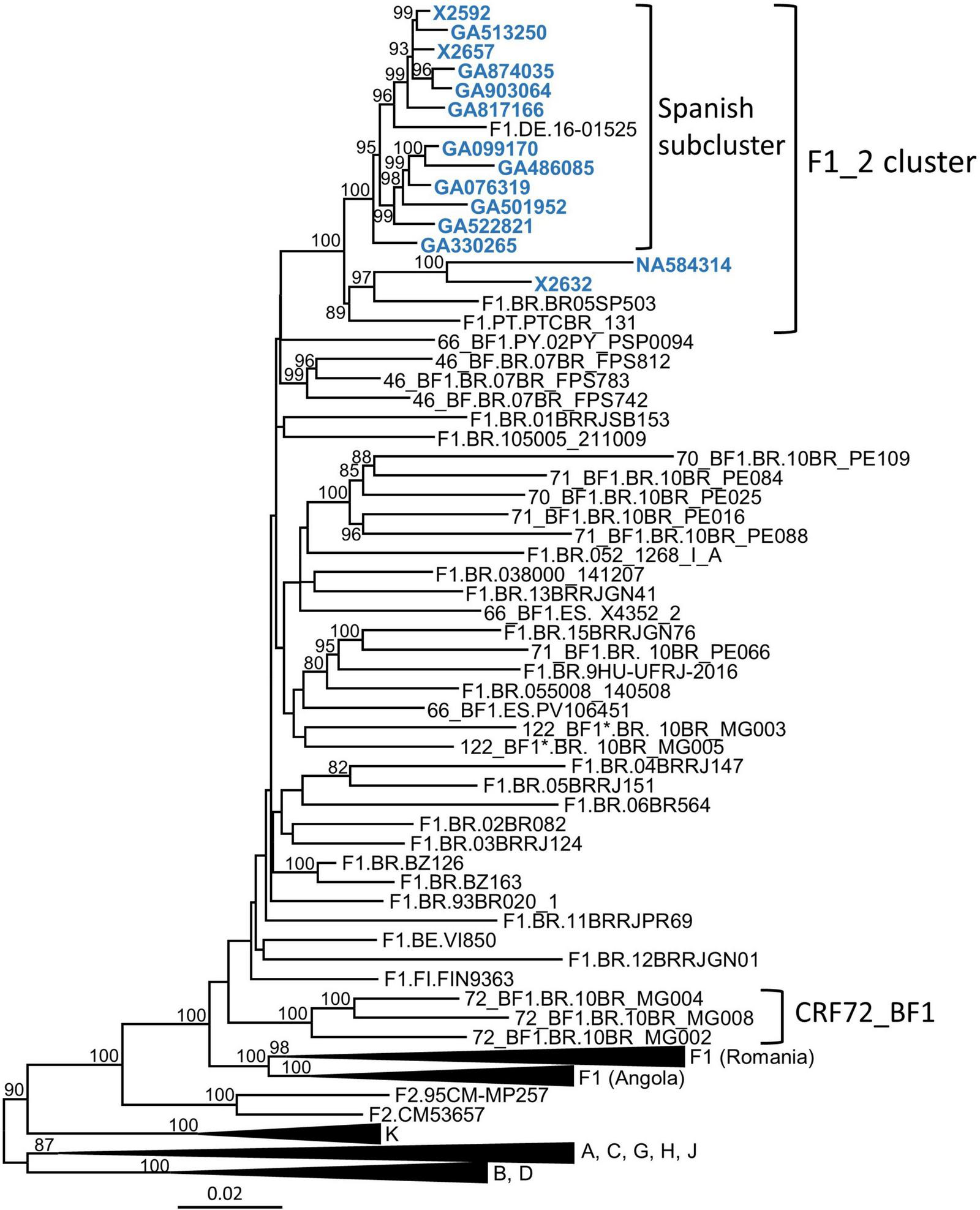 Figure 1. Maximum likelihood phylogenetic tree of Pr–RT sequences of the F1_2 cluster. Names of sequences obtained by us, all collected in Spain, are in blue. Only ultrafast bootstrap values ≥ 80% are shown. In database sequences, the country of sample collection is indicated before the virus name with the two-letter ISO country code: BE, Belgium; BR, Brazil, DE, Germany; ES, Spain; FI, Finland; PT, Portugal; PY, Paraguay. The scale indicates substitutions/site. *10BR_MG003 and 10BR_MG005 were originally identified as CRF72_BF1 (Pessôa et al., 2014b,2016), but analyses described in this study have reclassified them as CRF122_BF1.