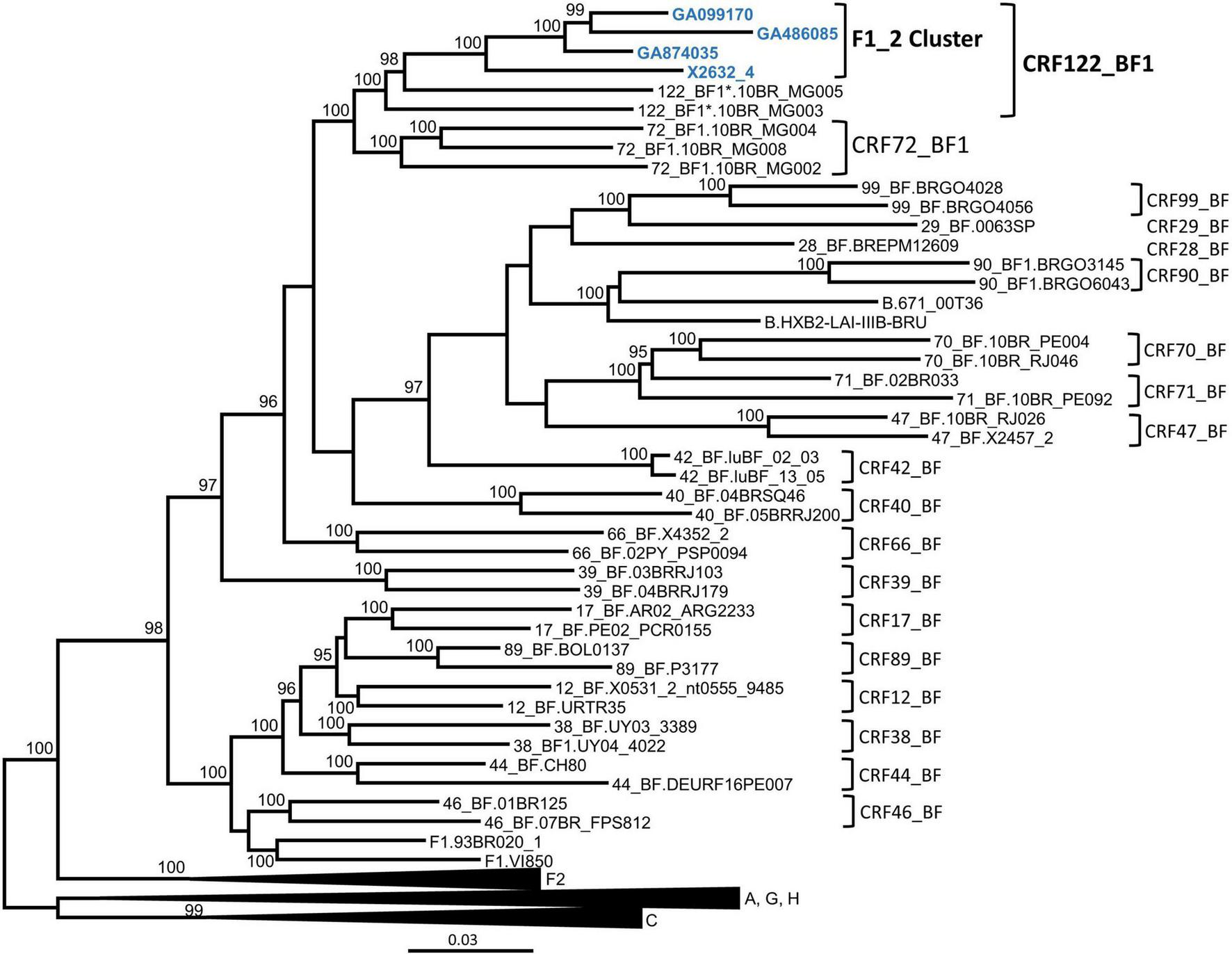 Figure 2. Maximum likelihood tree of NFLG sequences of viruses of the F1_2 cluster. References of published CRF_BFs and of HIV-1 subtypes are also included in the analysis. Names of sequences obtained by us are in blue. In reference sequences, the subtype or CRF is indicated before the virus name. Only ultrafast bootstrap values ≥ 90% are shown. The scale indicates substitutions/site. *10BR_MG003 and 10BR_MG005 were originally identified as CRF72_BF1 (Pessôa et al., 2014b,2016), but analyses described in this study have reclassified them as CRF122_BF1.