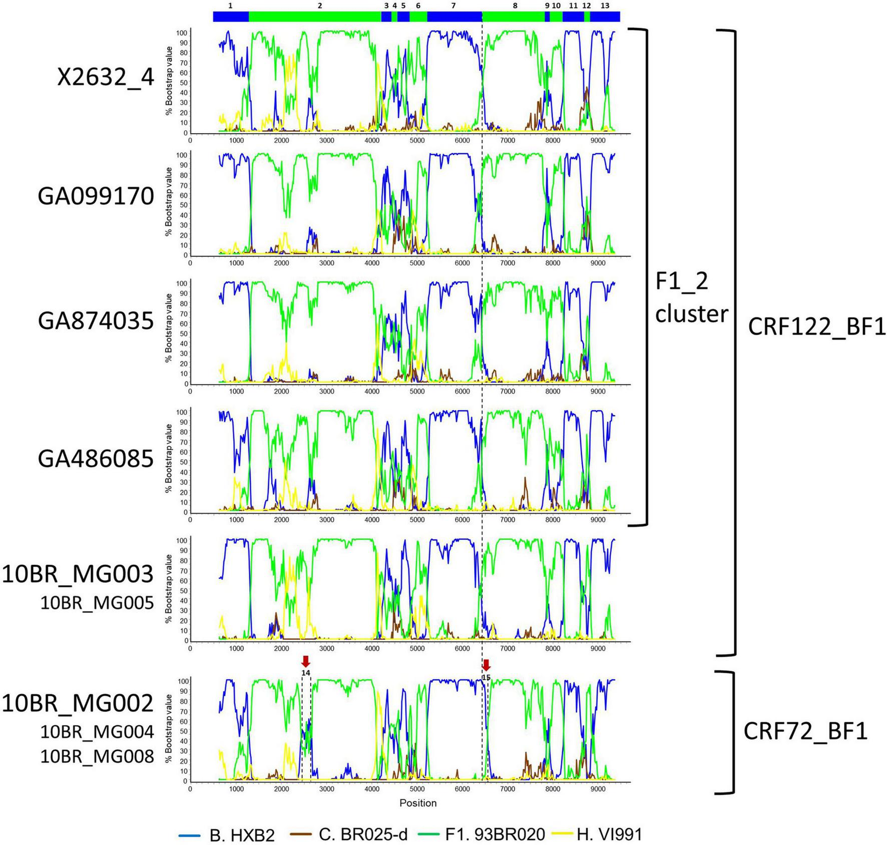 Figure 3. Bootscan analyses of NFLG sequences of viruses of the F1_2 cluster compared to those of viruses previously classified as CRF72_BF1. Bootscan plots of all four F1_2 viruses are shown, together with those of 10BR_MG003 and 10BR_MG002. The bootscan plot of 10BR_MG005 is almost identical to that of 10BR_MG003, and those of 10BR_MG004 and 10BR_MG008 are almost identical to that of 10BR_MG002, and are shown in Supplementary Figure 1. The horizontal axis represents the position in the HXB2 genome of the midpoint of a 250-nt window moving in 20-nt increments, and the vertical axis represents bootstrap values supporting clustering with subtype reference sequences. The vertical dashed lines indicate BF1 breakpoints differing between the CRF72_BF1 viruses 10BR_MG002, 10BR_MG004, and 10BR_MG008, on the one hand, and viruses of the F1_2 cluster and 10BR_MG003 and 10BR_MG005 (newly identified as CRF122_BF1), on the other. The bar on the top indicates the segments that were further analyzed with ML and Bayesian trees (Figure 4). Two genome segments that appear to group with different subtypes in 10BR_MG002, 10BR_MG004, and 10BR_MG008 relative to 10BR_MG003, 10BR_MG005, and the F1_2 viruses are signaled with arrows above the bootscan plot of 10BR_MG002 and were also analyzed via ML and Bayesian inference (Figure 4).