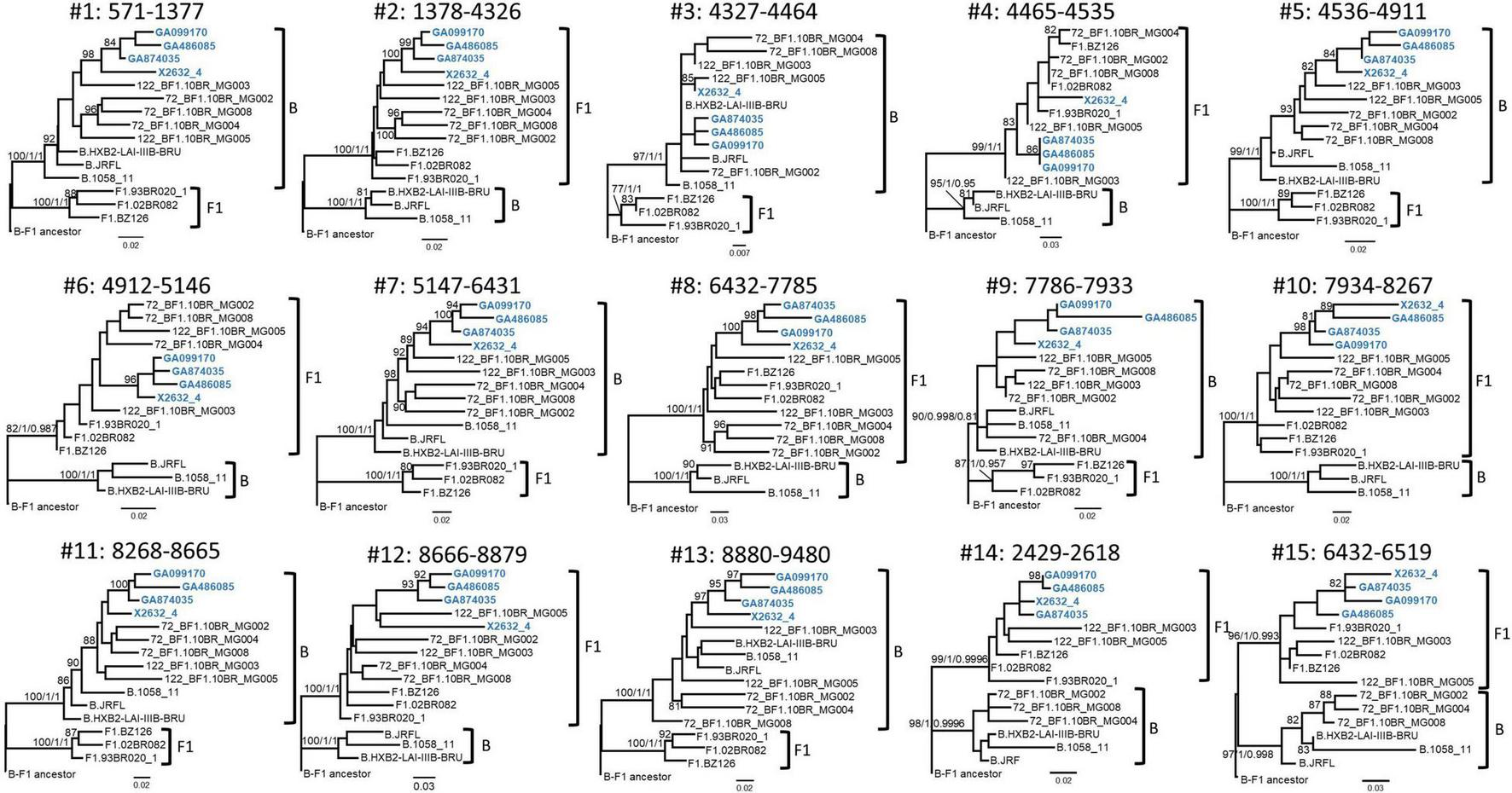 Figure 4. Phylogenetic trees of interbreakpoint genome segments of F1_2 viruses. Breakpoints were defined according to the bootscan analyses and to midpoints of transitions between subtype-discriminating nucleotides, here defined as those where the 75% consensus of subtype B and of the Brazilian variant of subsubtype F1 differ. HXB2 positions delimiting the analyzed segments and their numbers as indicated in Figure 3 are indicated on top of the trees. Sequence names of F1_2 viruses are in blue. Names of subtype reference sequences are preceded by the corresponding subtype name. Sequences of viruses previously classified as CRF72_BF1 were also included, with those reclassified in the present study as CRF122_BF1 (10BR_MG003 and 10BR_MG005) labeled with the new CRF designation. The trees are rooted with a reconstructed BF1 ancestor. Node supports for B and F1 clades are indicated, in this order, as ultrafast bootstrap value/aLRT SH–like support/posterior probability, which were obtained with IQ-Tree, PhyML, and MrBayes programs, respectively. For the other nodes, only ultrafast bootstrap values ≥ 80% are indicated. Trees #14 and #15 (segments 2429–2618 and 6432–6519, respectively) correspond to the segments indicated with arrows in Figure 3, where F1_2 viruses and 10BR_MG003 and 10BR_MG005, on the one hand, and 10BR_MG002, 10BR_MG004, and 10BR_MG008, on the other, appeared to differ in subtype affiliations in the bootscan analyses. The scales indicate substitutions/site.