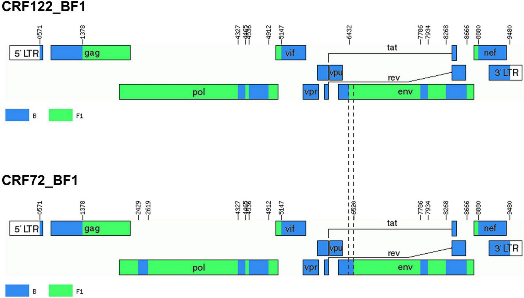 Figure 5. Mosaic structures of CRF72_BF1 and CRF122_BF1. Breakpoint positions are numbered as in the HXB2 genome. Vertical dashed lines indicate the BF1 breakpoint positions in the 5′ segment of gp120env differing between CRF122_BF1 and CRF72_BF1. The drawing was made using the Recombinant HIV-1 Drawing Tool (https://www.hiv.lanl.gov/content/sequence/DRAW_CRF/recom_mapper.html).