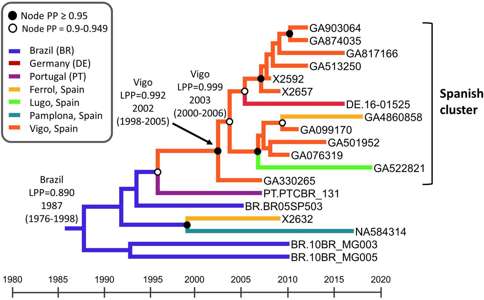 Figure 6. Maximum clade credibility tree of CRF122_BF Pr–RT sequences. Branch colors indicate, for terminal branches, the place of sample collection and, for internal branches, the most probable location of the subtending node, according to the legend on the upper left. Nodes supported by PP ≥ 0.95 and PP 0.9–0.949 are indicated with filled and unfilled circles, respectively. The most probable locations at the root of the tree and at the node of the Spanish cluster are indicated, together with the PPs supporting each location (LPPs) and the year estimated for the MRCAs (mean value, with 95% HPD interval in parentheses). The scale under the tree represents calendar years.
