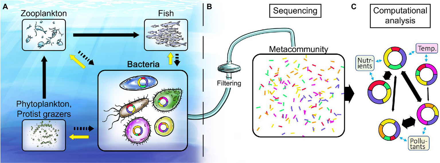 Figure 1. Illustration of the marine food web and proposed analysis workflow for disentangling linkages between environmental stressors and genomic structure and content of key marine bacteria. (A) Bacteria are fundamental in recycling of nutrients including dissolved organic carbon (black arrows to bacteria) and in providing ecosystem-wide services to higher trophic levels (yellow arrows). (B) Current state of the art methodology is based on sampling of the total nucleic acid (DNA and/or RNA) content of marine environments. (C) Computational analyses provide metagenome-assembled genomes (MAGs) that give unprecedented insights into both the identity of key bacterial populations and the genes underlying their different functional traits. Doughnut shapes represent genomes of such key bacterial populations and the colored doughnut sections denote traits. Co-occurrence network analysis of bacterial populations and their traits (black arrows between genomes) allows for identification of traits responsive to global change variables (blue arrows) and ultimately the ecosystem services supplied by key bacteria.