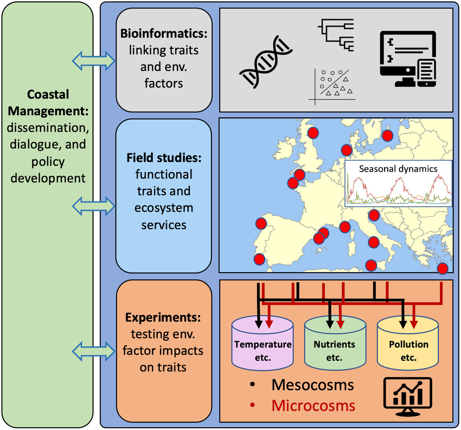 Figure 2. Research strategy to obtain comprehensive understanding of the genetic responses of key marine bacteria to environmental stressors in coastal waters, using European waters as an example. Bioinformatics for developing computational tools and workflows to effectively interpret linkages between functional traits and environmental factors. Field studies to generate and evaluate data on traits of key bacterial populations (from genomes and transcriptomes) and their distributions in time and space in relation to variability in environmental conditions. Experiments to identify and confirm relationships between environmental factors and specific traits and bacterial populations. Synergies between computational analyses of genomics, distributions and measured variability in environmental variables from field studies and experiments are essential to identify how bacterial functional traits can form the basis for genetic counselling of coastal seas. Dialogs with societal actors through all steps in the research strategy will be needed for reaching the goal of using bacteria to improve the quality of actions in coastal management.
