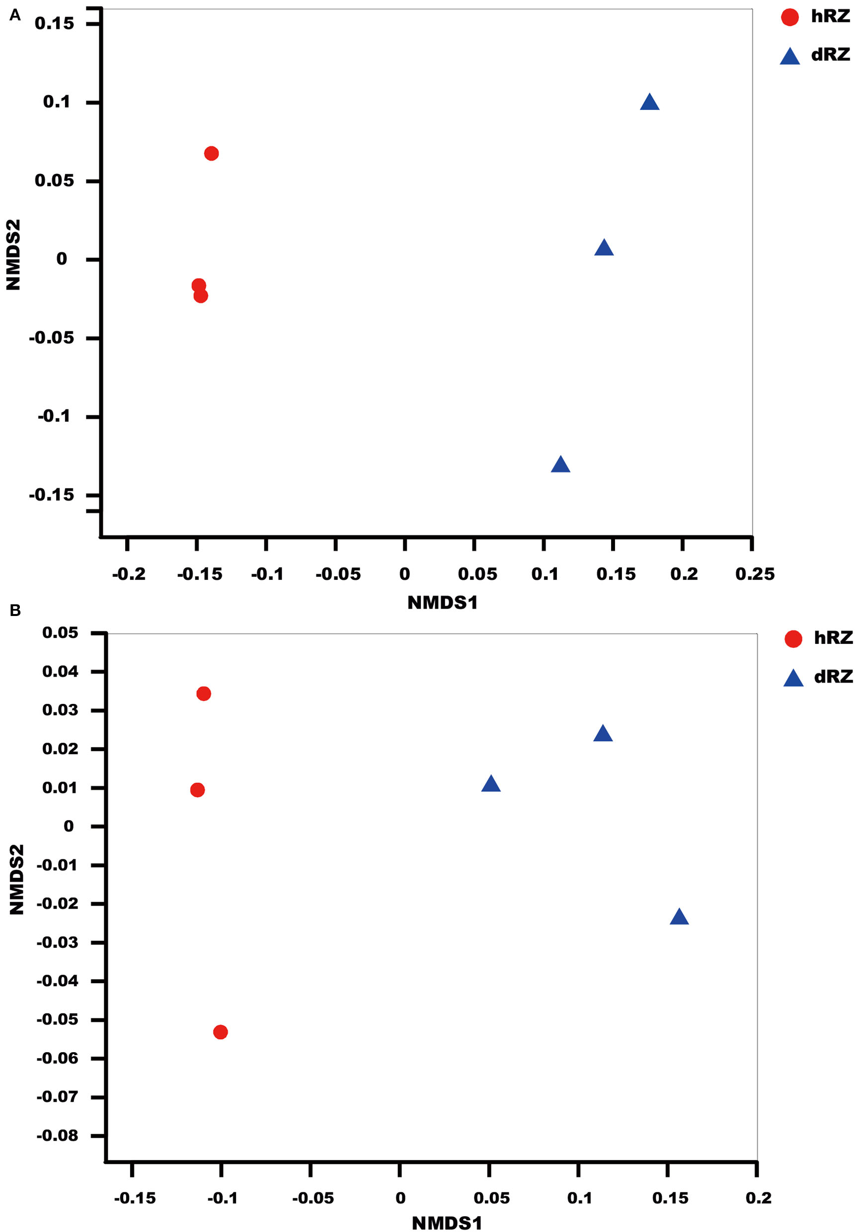 Figure 1. NMDS (non-metric multidimensional scaling) ordination based on Bray–Curtis similarities of prokaryotic (A) and fungal (B) OTU community structures among different samples. hRZ, healthy rhizosphere soils; dRZ, diseased rhizosphere soils (n = 3).